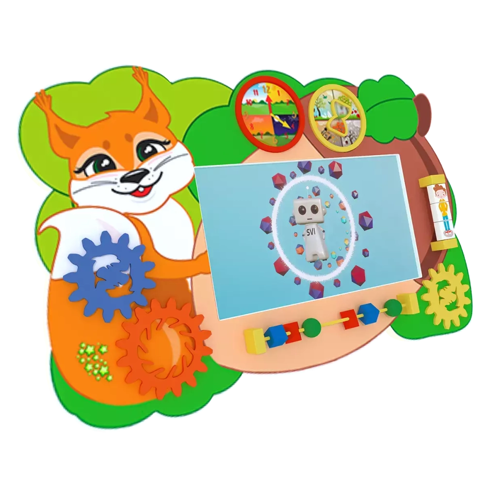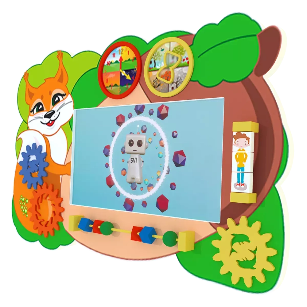 Яркий настенный модуль с оригинальным дизайном. Занятия с данным комплексом способствуют развитию памяти, мышления, логики, внимательности, усидчивости, моторики рук. В комплект входят задания по азбуке и арифметике, сказки, раскраски, пазлы (156 игр и приложений). Кроме того детям будут интересны крутящиеся элементы, счеты, сортировка геометрических фигур, часы, песочные часы и др. Может быть задействован на занятиях с детьми с ОВЗ.