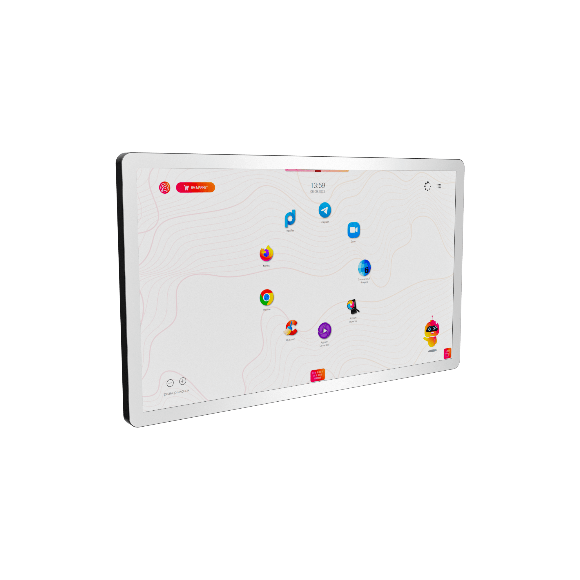 Новейшая многофункциональная панель в простом и современном дизайне не занимает много места, крепится на стену или на мобильную стойку на колесиках с фиксаторами. Это прекрасное решение для музеев, выставочных центров, образовательных учреждений (школ, колледжей, вузов и т.д.). Наша оболочка Aura работает с презентациями и всеми офисными приложениями.