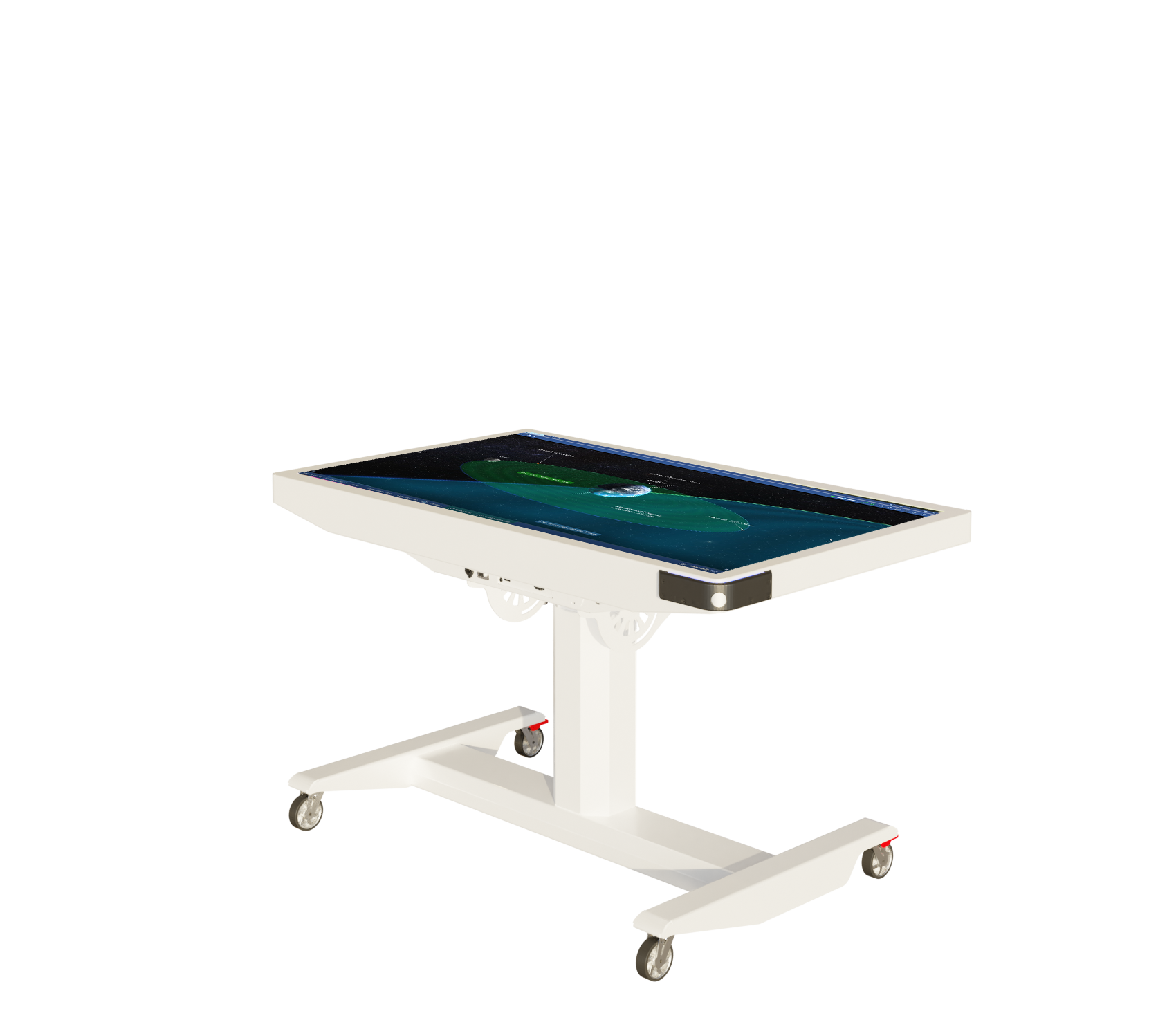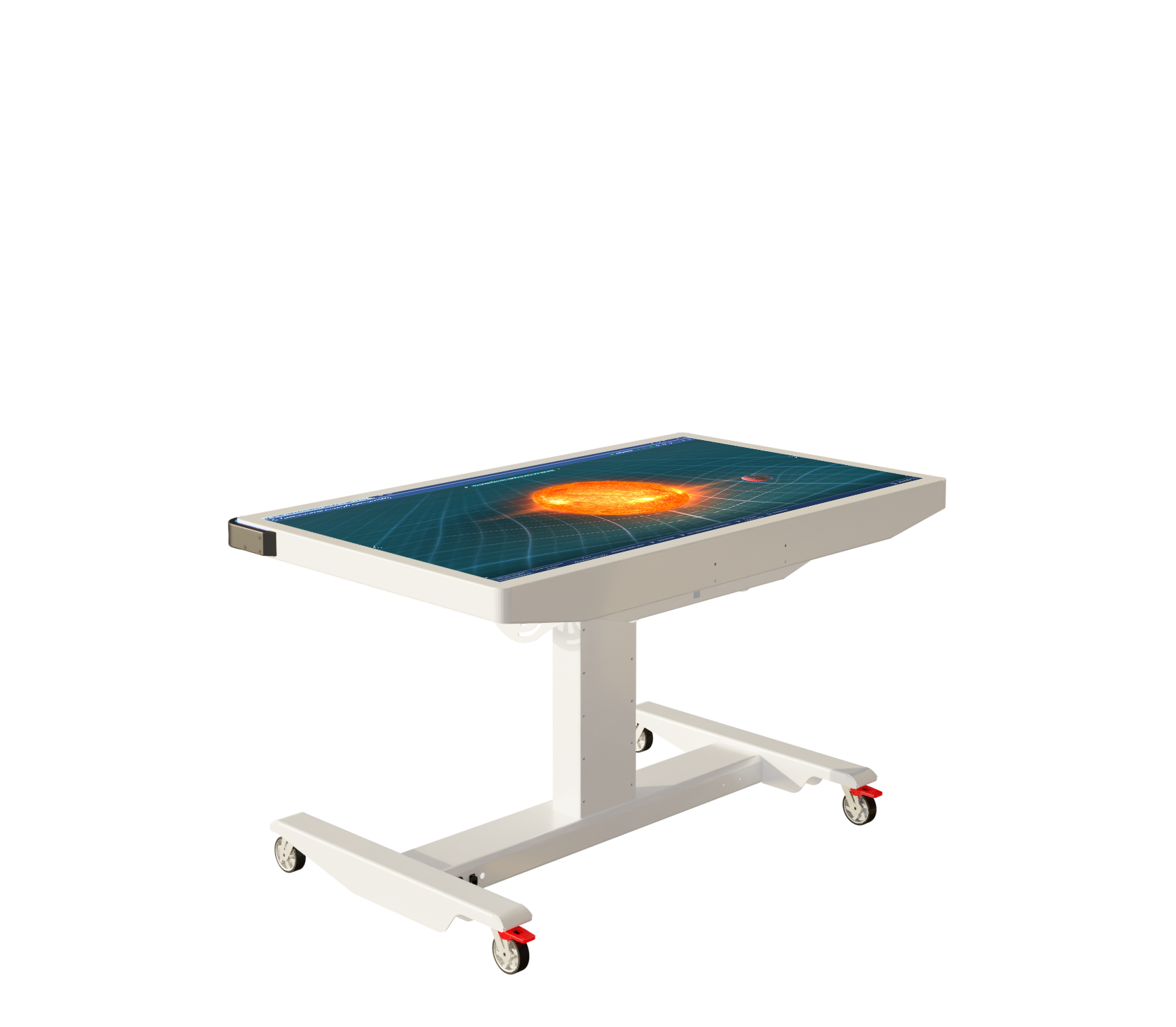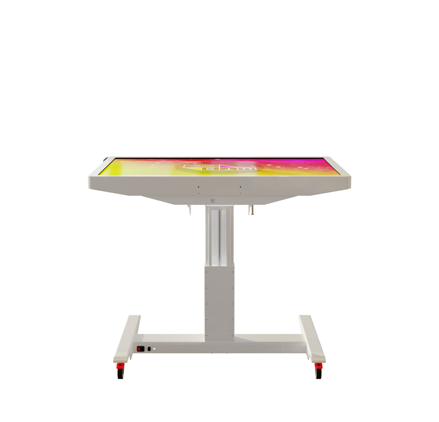 Многофункциональный трансформер 2 в 1 (панель и стол), оснащен передвижной стойкой на колесах, при желании панель можно закрепить на стене. Угол наклона изменяется в пределах 90°, высота регулируется электроприводом в пределах 27 - 55 см. Корпус выполнен из металла 1,5-2 мм. Экран защищен ударопрочным каленым стеклом. Панель оснащена USB-разъемами, встроенной звуковой системой и функцией «мультитач» до 20 одновременных касаний.