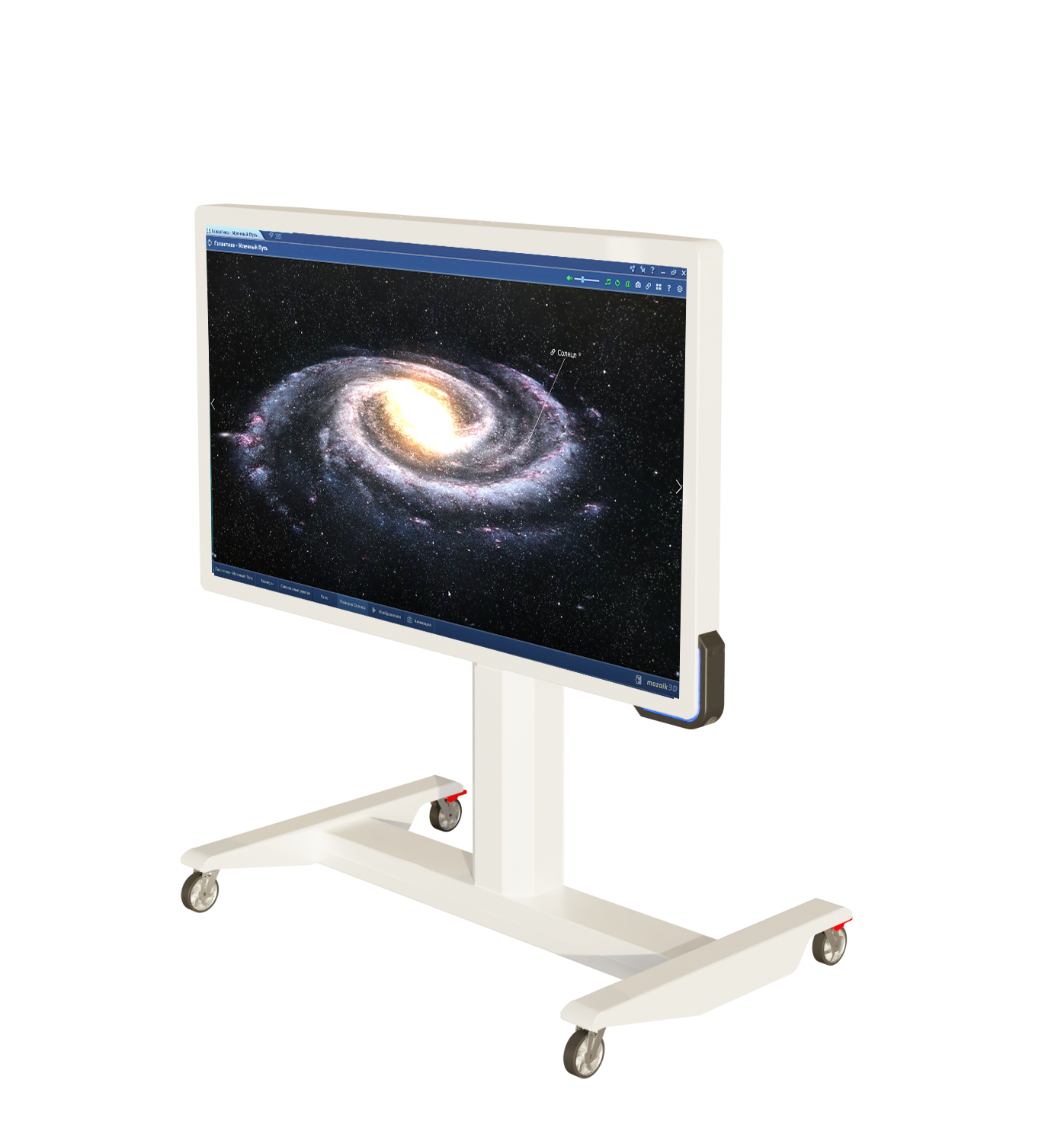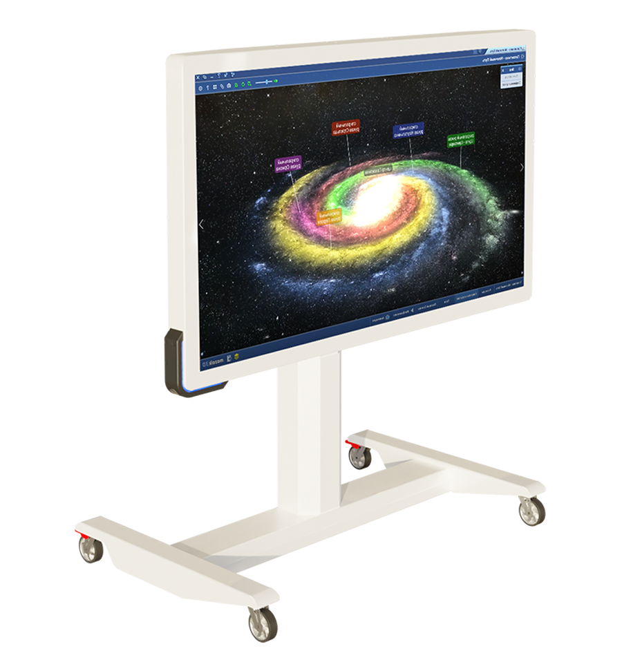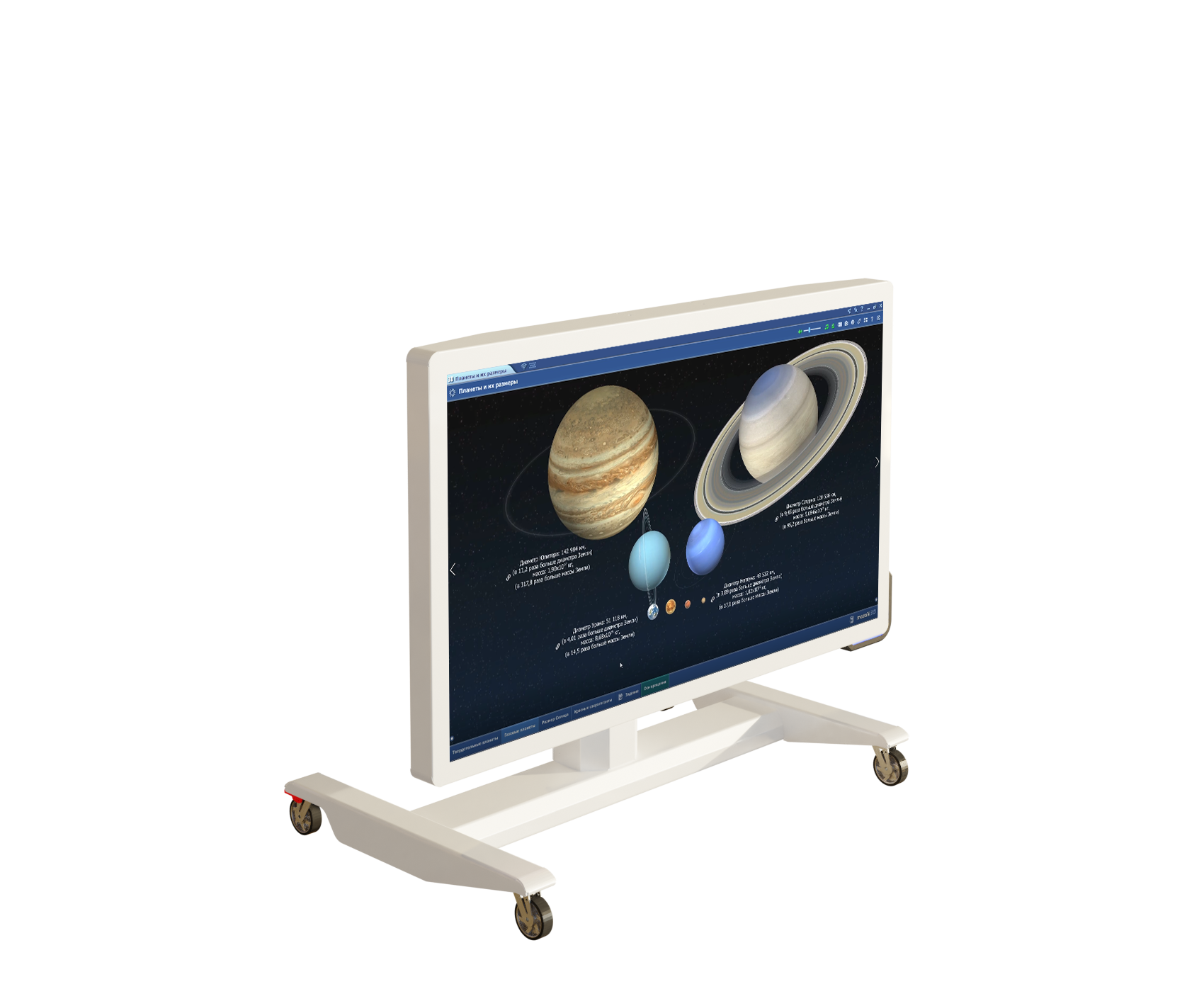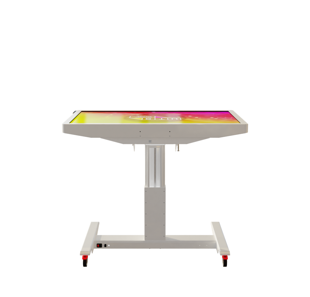 Многофункциональный трансформер 2 в 1 (панель и стол), оснащен передвижной стойкой на колесах, при желании панель можно закрепить на стене. Угол наклона изменяется в пределах 90°, высота регулируется электроприводом в пределах 27 - 55 см. Корпус выполнен из металла 1,5-2 мм. Экран защищен ударопрочным каленым стеклом. Панель оснащена USB-разъемами, встроенной звуковой системой и функцией «мультитач» до 20 одновременных касаний.