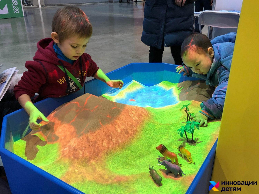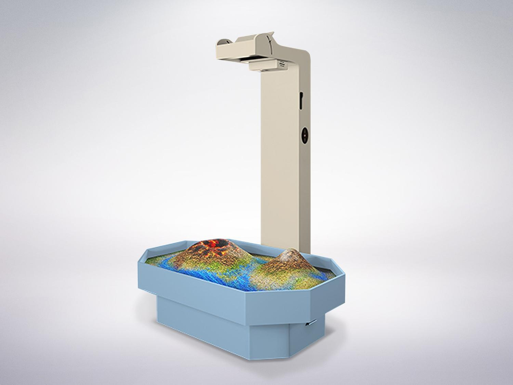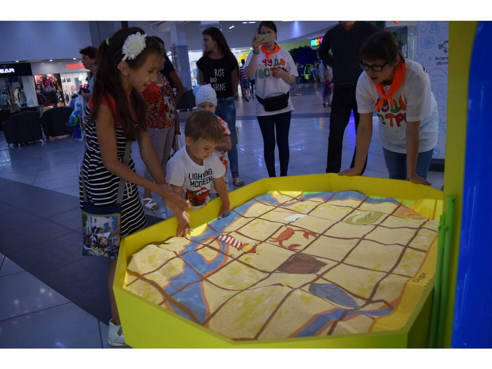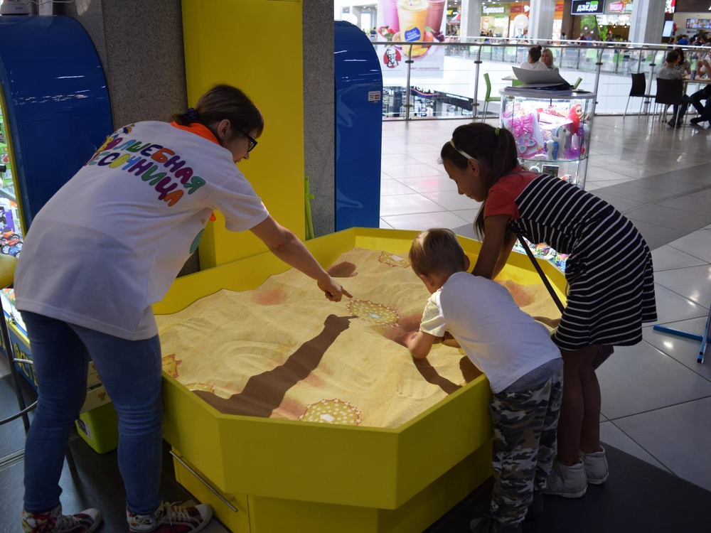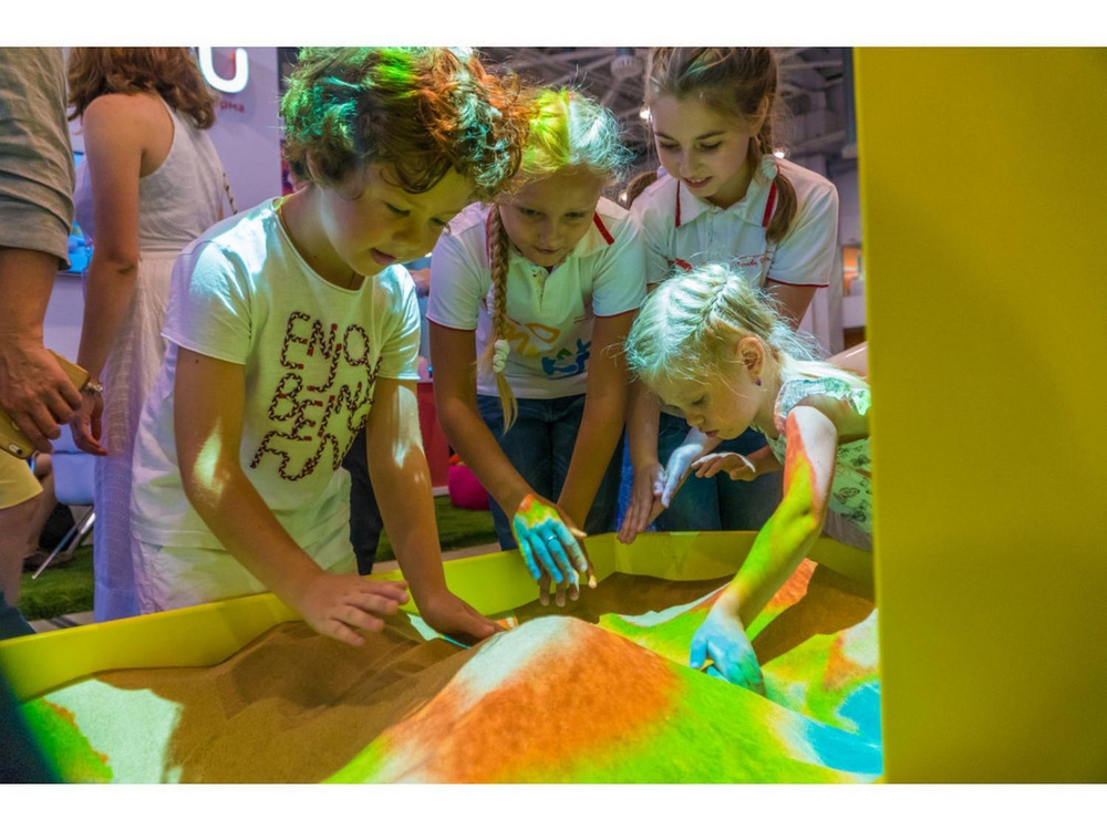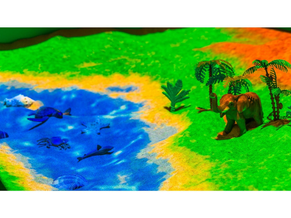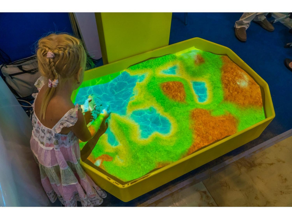 Многофункциональность. Оборудование можно использовать как обычную песочницу, потом включить проектор в верхней части стойки – и получить интерактивную песочницу, где от каждого движения ребёнка меняется рельеф поверхности: текут реки, вырастают горы, извергаются вулканы! Если закрыть игровое поле панелями, то получится сенсорный стол, а третий режим – арт-песочница Sandia.