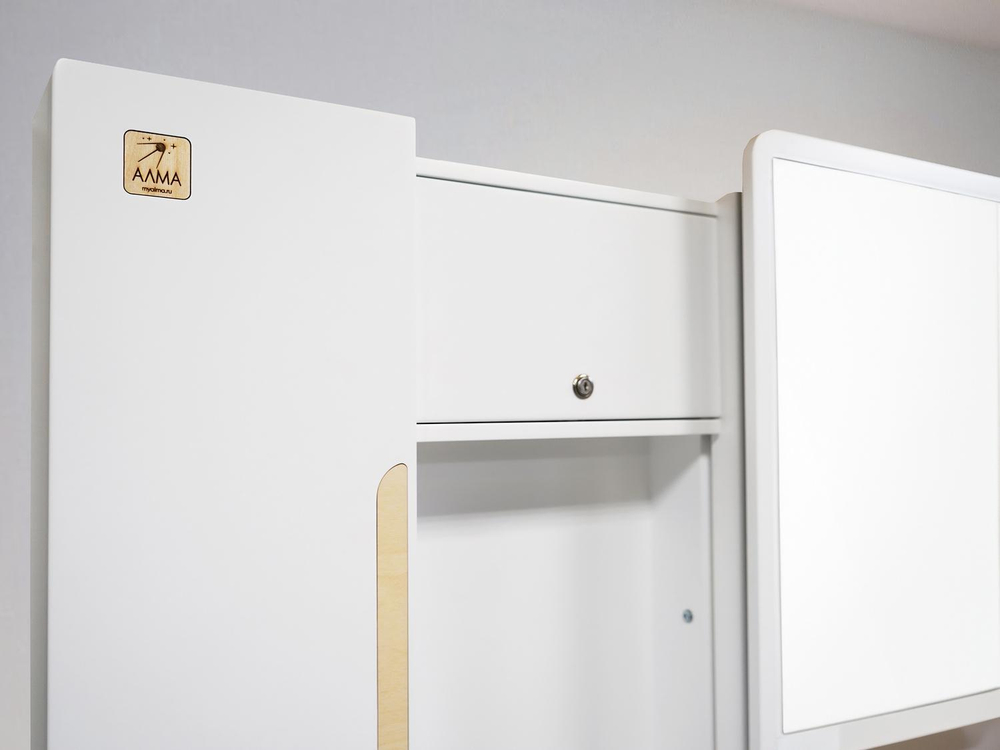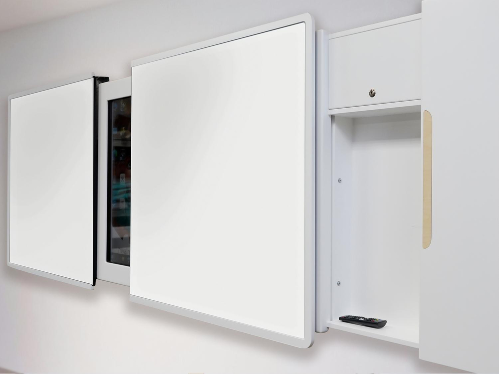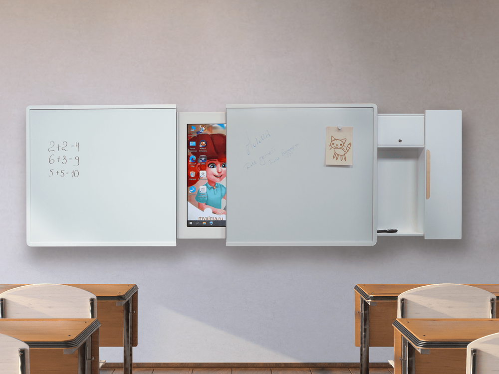 Удобство и эргономичность конструкции. Раздвижная система створок имеет прочную конструкцию и плавный ход благодаря доводчикам. По бокам интерактивной раздвижной доски находятся закрытые секции с полочками, где удобно хранить обучающий материал, маркеры, губки, пульты управления и прочий инвентарь, нужный для преподавательской работы. Запирающаяся на ключ секция, куда можно убрать ноутбук преподавателя, становится доступна при максимальном сдвигании двух магнитно-маркерных поверхностей в противоположную от секции сторону.