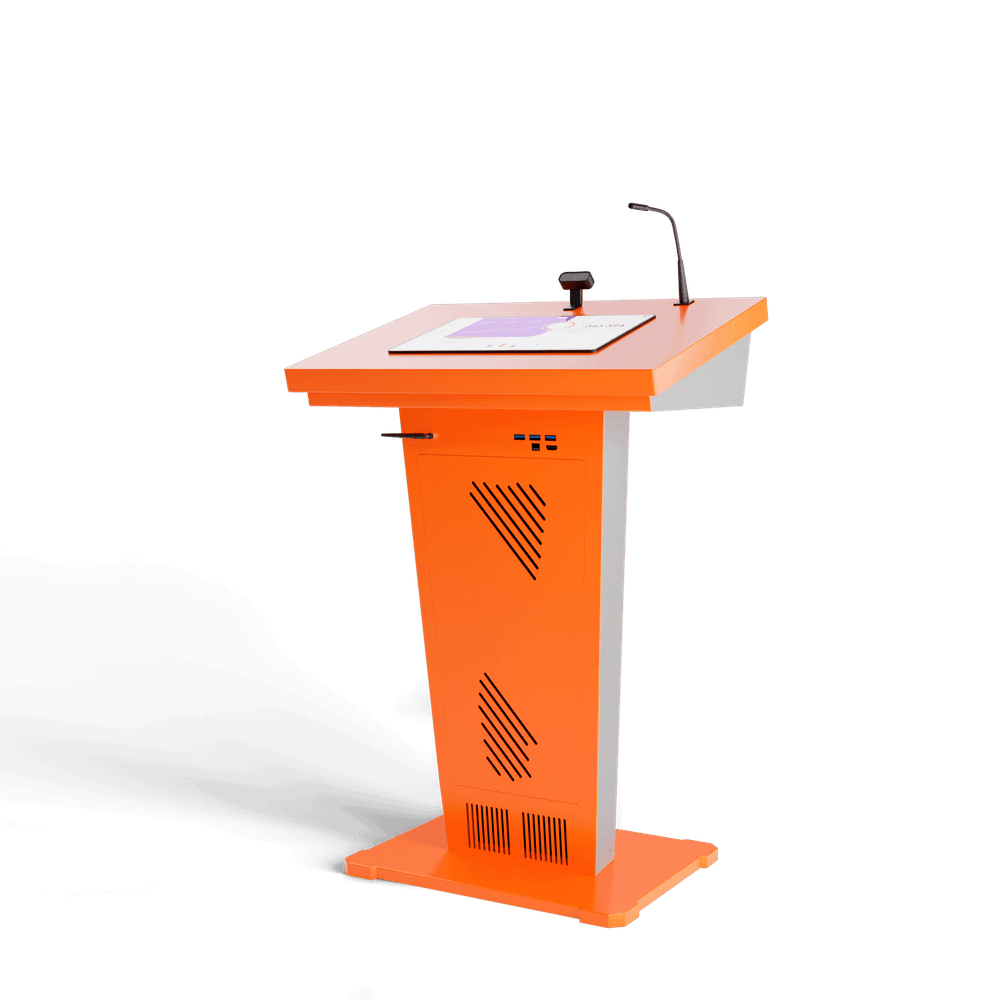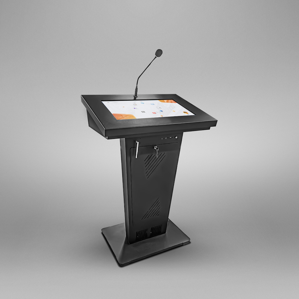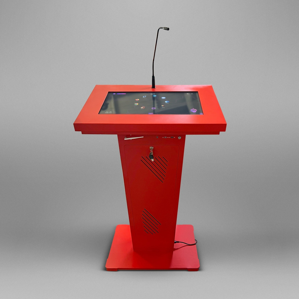Эта интерактивная трибуна удивляет своим футуристическим и запоминающимся дизайном, а также имеет передовую техническую начинку. В ней предусмотрены все необходимые элементы для успешных выступлений: микрофоны, колонки, усилитель звука, разъемы для подключения оборудования. Также она оснащена большим сенсорным дисплеем и возможностью вывода информации на большой экран.