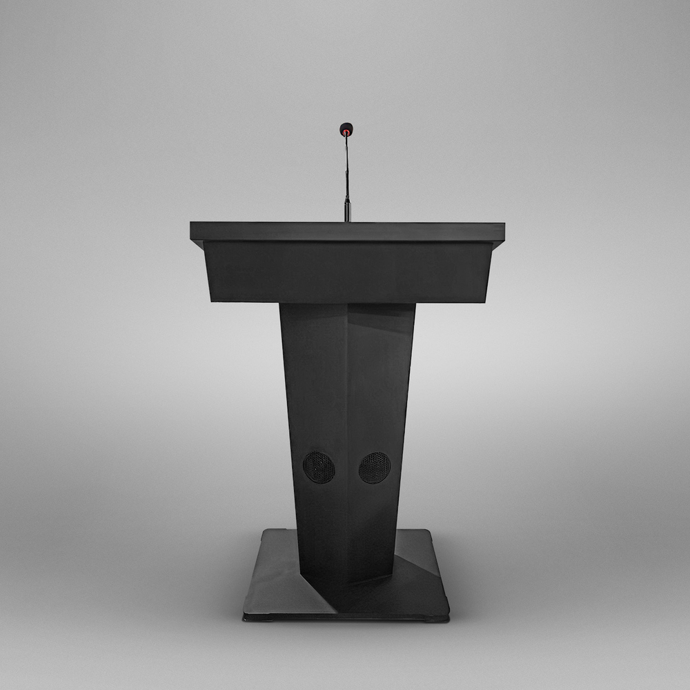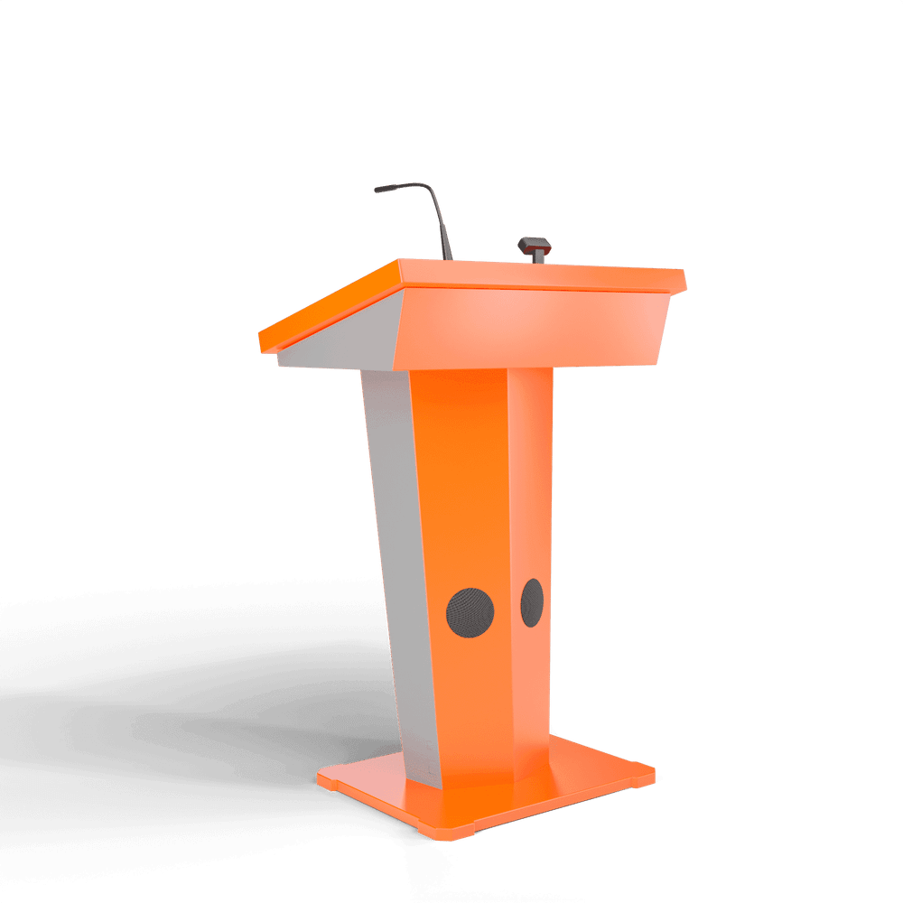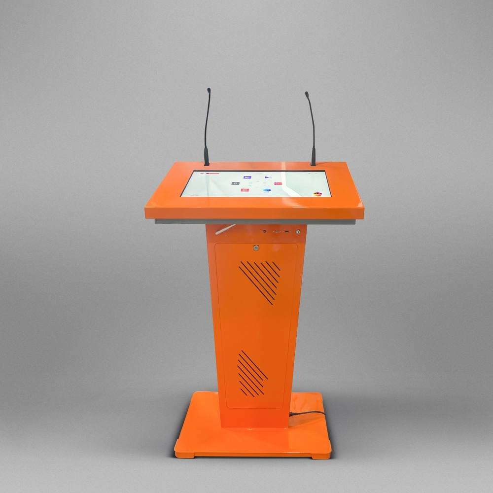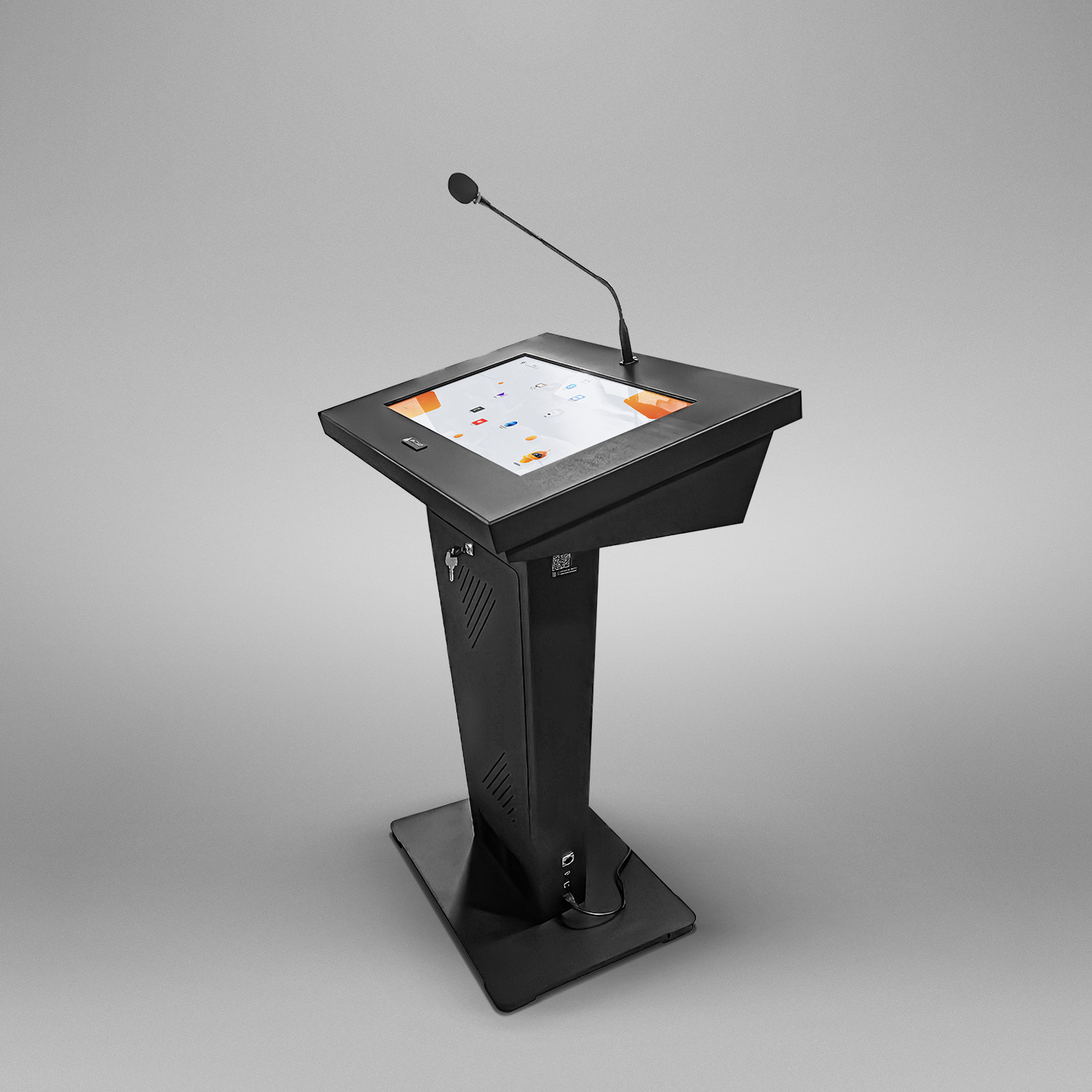 Эта интерактивная трибуна удивляет своим футуристическим и запоминающимся дизайном, а также имеет передовую техническую начинку. В ней предусмотрены все необходимые элементы для успешных выступлений: микрофоны, колонки, усилитель звука, разъемы для подключения оборудования. Также она оснащена большим сенсорным дисплеем и возможностью вывода информации на большой экран.