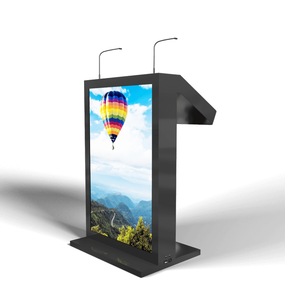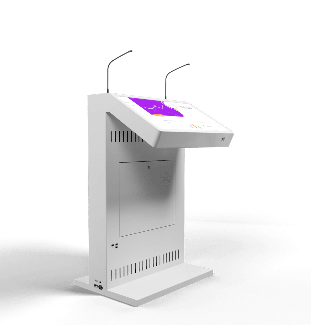 Мы разработали особую модель интерактивной трибуны – с большим внешним дисплеем, на котором можно демонстрировать ролики, презентации, логотипы спонсоров и т.д. Трибуна оснащена двумя микрофонами, сенсорным дисплеем для спикера и набором разъемов для подключения дополнительной аппаратуры.