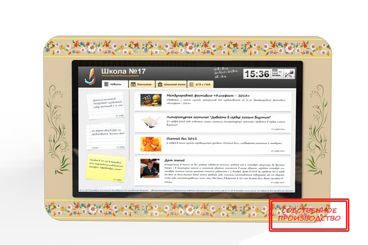 Размещается такой комплекс в фойе, холле, коридоре школ, вузов, либо других средних и высших образовательных заведений. В качестве информативного контента могут выступать текстовые файлы, видео, фотографии. Создавайте с помощью программного обеспечения поздравления, объявления, расписания, новости.