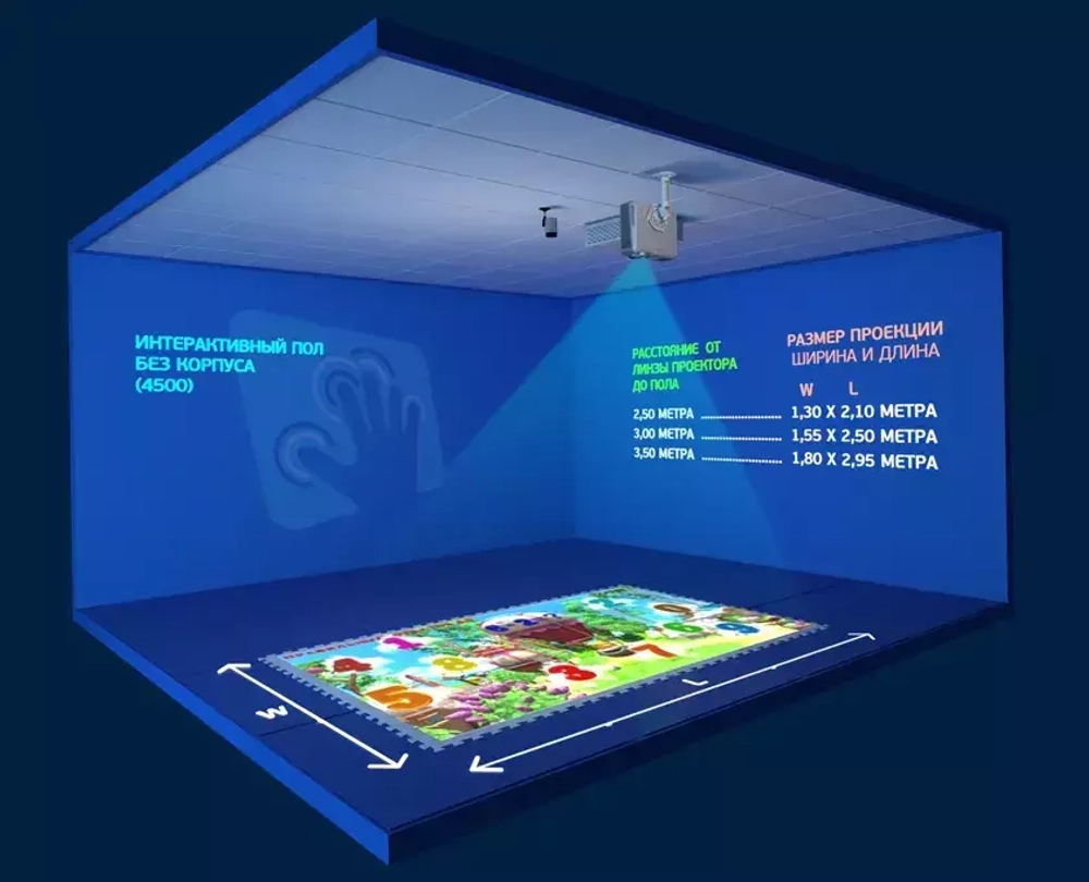 Оборудование для интерактивных классиков монтируется на потолок. Изображение проецируется на пол. В комплект входит понятная инструкция по монтажу и настройке оборудования.
