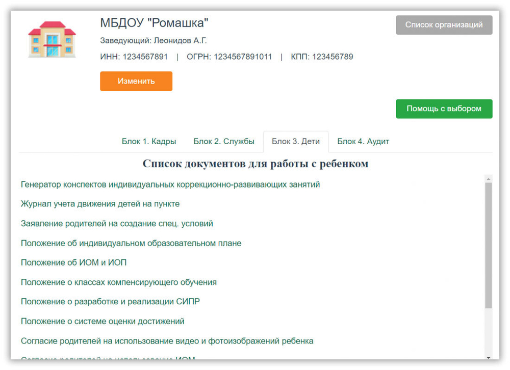 - для работы с детьми (блок «Дети»): согласия родителей, конспекты занятий, положение о СИПР, ИОМ и т.д.