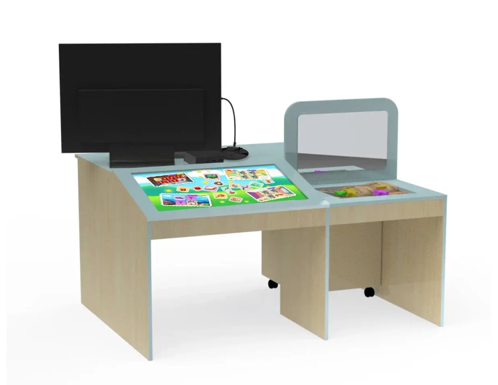 Логопедический стол "Logo Sand" представляет собой интерактивный комплекс, оборудованный сенсорным экраном 32" и встроенным световым планшетом для песочной анимации.