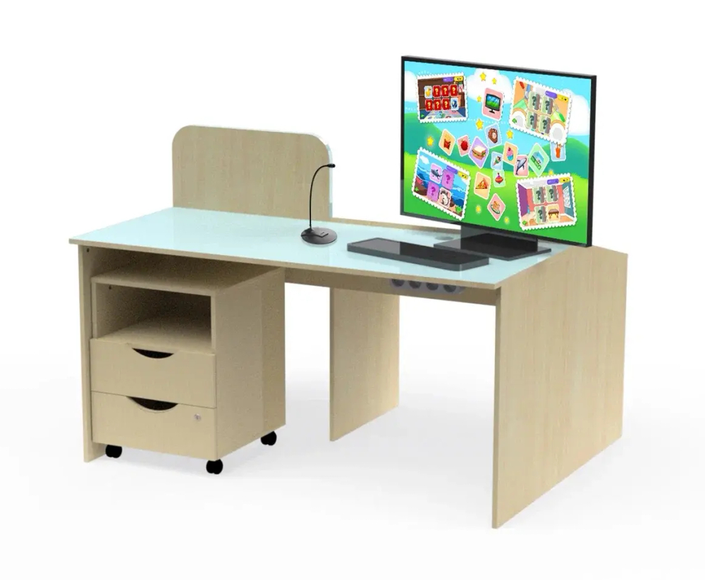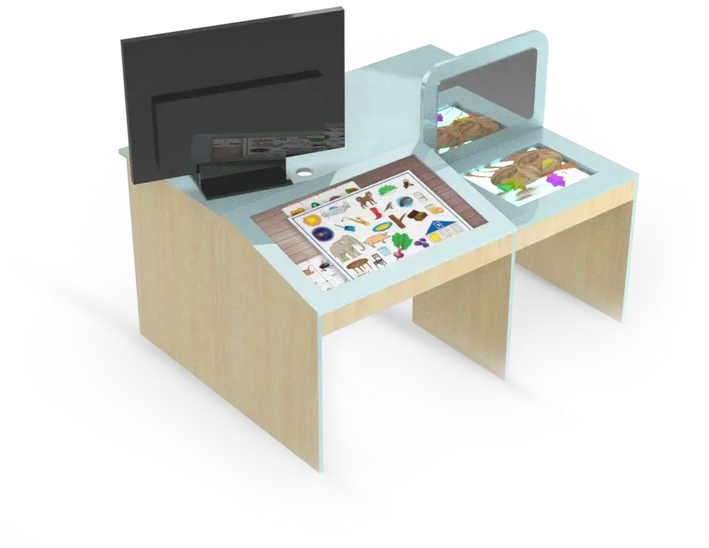Конструкция стола сделана таким образом, чтобы одна сторона была предназначена для работы преподавателя, а другая для детей. Изображение с компьютера транслируется на оба экрана одновременно, при этом педагог может контролировать процесс, отключая сенсорную функцию экрана у ребенка когда это необходимо.