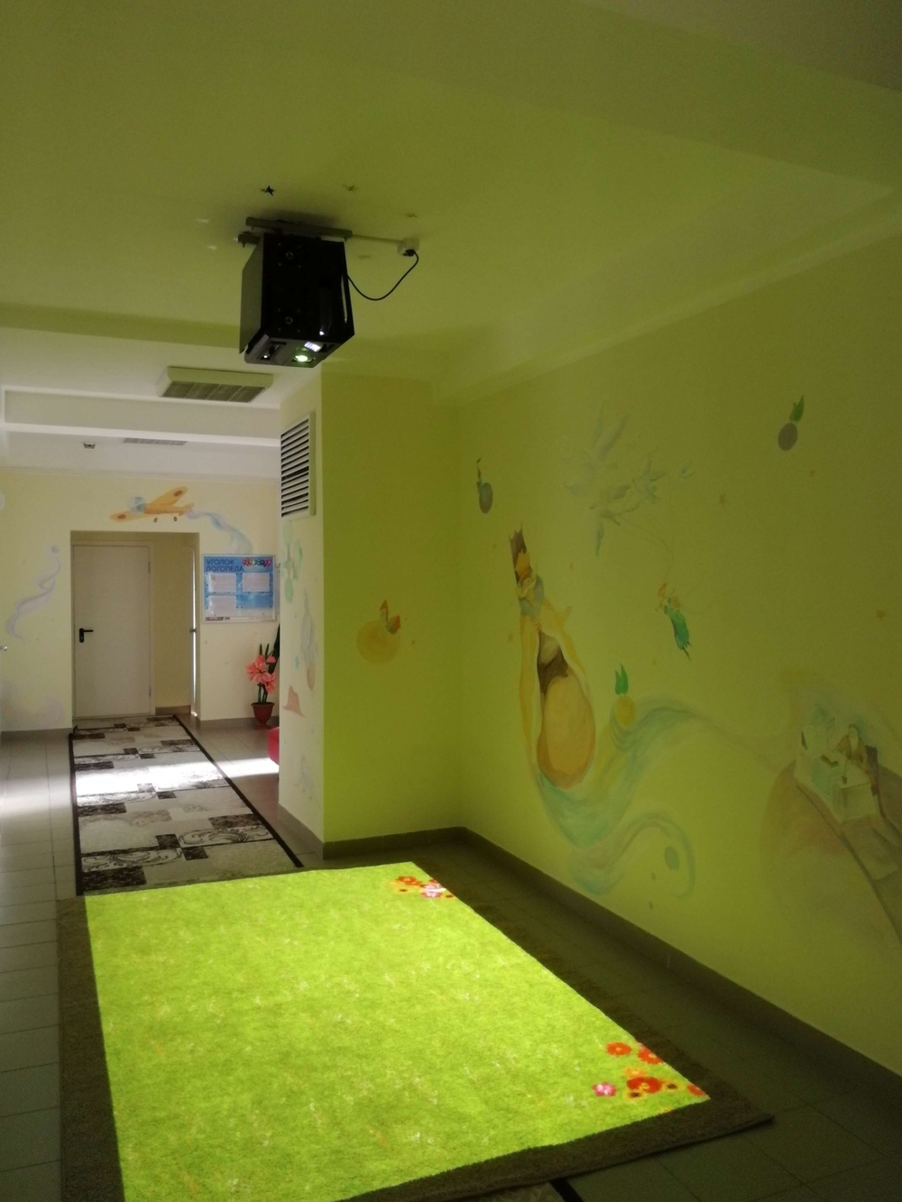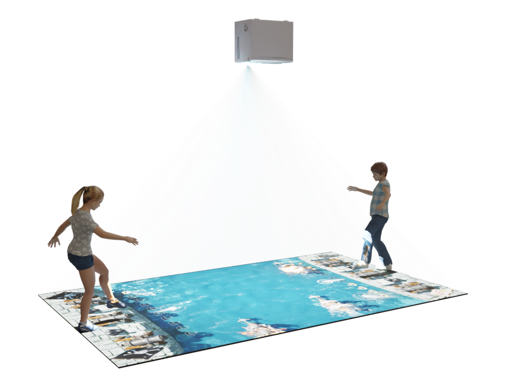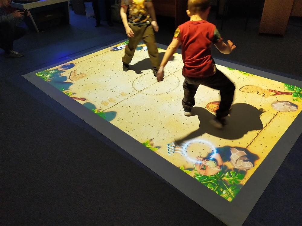Другими словами, оборудование превращает поверхность пола в большой интерактивный экран. На экране отображается игровой мир, с которым ребенок может взаимодействует в режиме реального времени.