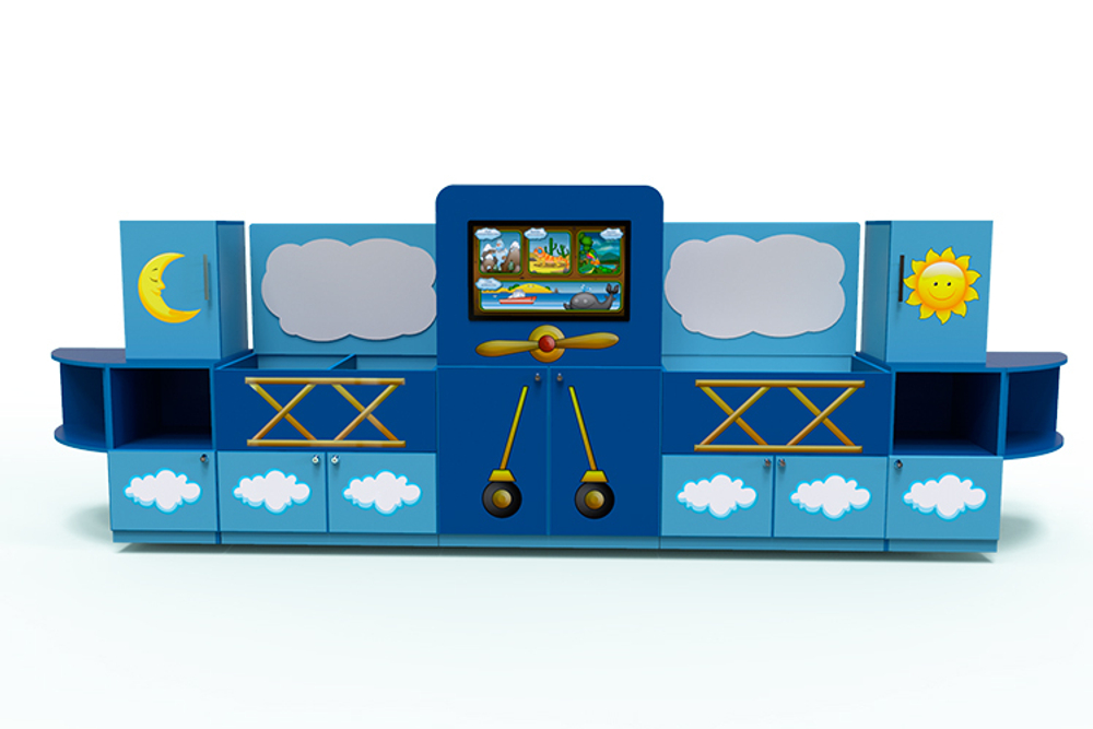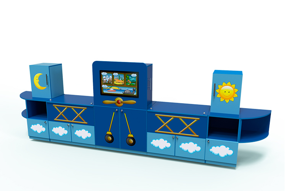 Комплекс «Логопедический Самолет» достаточно большой, размером 1516 х 3111 х 500 мм. Изготовлен из ламинированной ДСП. Оснащен: