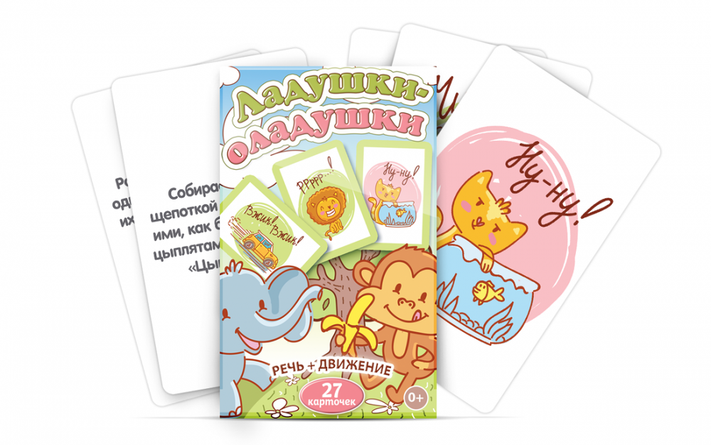 Ладушки-оладушки — комлпект карточек для активизации речи малышей и «неговорящих» детей. Во время занятий ребенок многократно повторяет простые звуковые сочетания и совмещает их с движением.