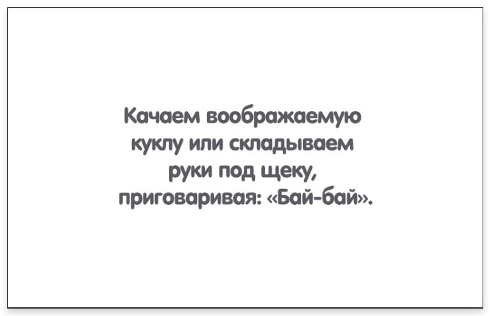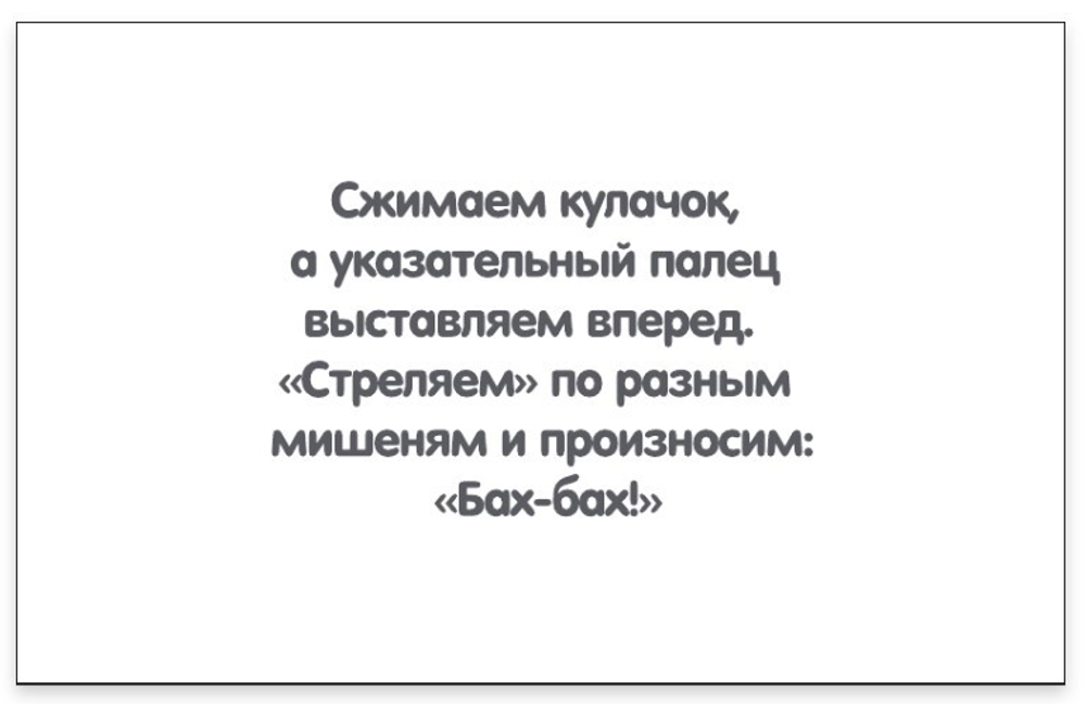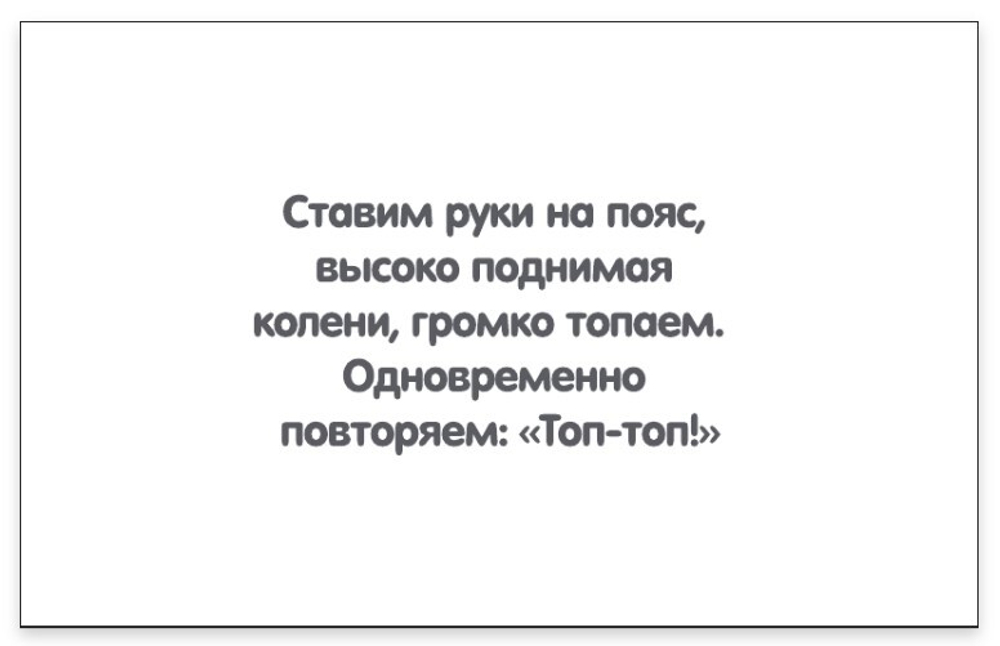 В наборе 27 двусторонних карточек. На одной стороне карточки нарисовано действие и его озвучка: машинка едет — «вжик-вжик», слон топает — «топ-топ». На другой стороне инструкции: возьми машинку и покатай по полу, поставь руки на пояс и потопай.