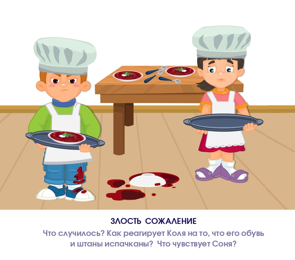 Знакомые ситуации помогают ребенку легче распознать контекст на картинке, а специалисту — выстроить разговор вокруг эмоциональной составляющей сюжета.