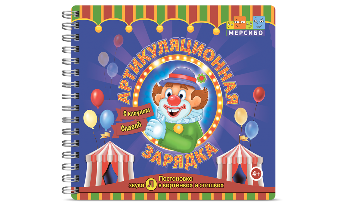В наборе 11 артикуляционных упражнений, скрепленных спиралью: «Качели», «Заборчик», «Ветерок» и другие классические задания. Упражнения сюжетно объединены историей клоуна Славы.