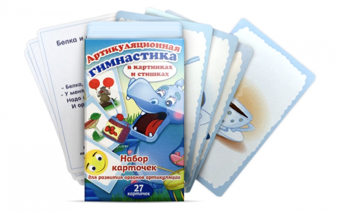В наборе 27 двусторонних карточек с популярными артикуляционными упражнениями: «Лошадка», «Заборчик», «Ветерок» и т.д.
