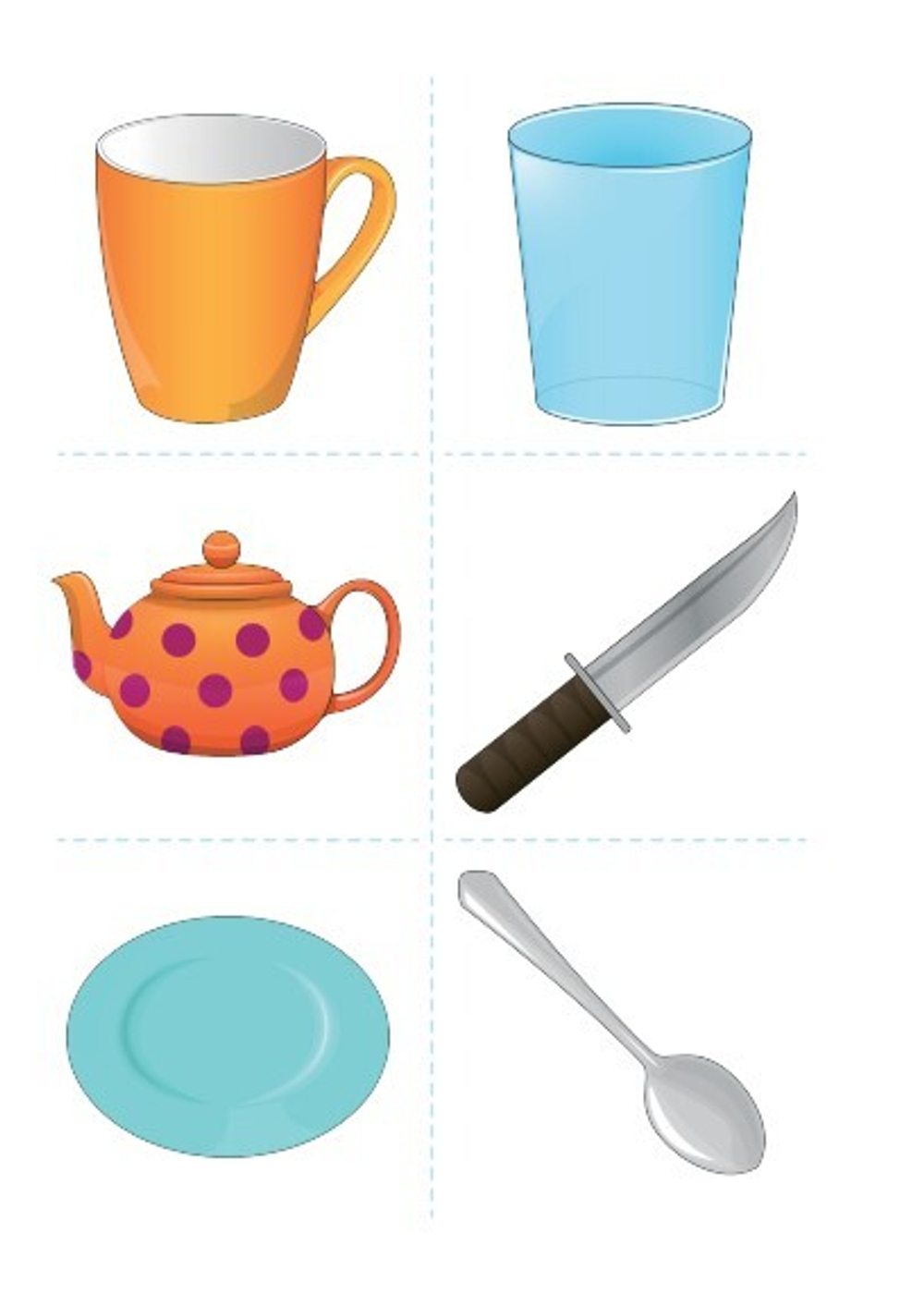 В наборе 6 двусторонних открыток на спирали. На одной открытке 6 картинок, объединенных общей темой. Например, тема «Посуда»: чашка, стакан, ложка, тарелка, чайник и нож. Картинки крупные, яркие и понятные детям.