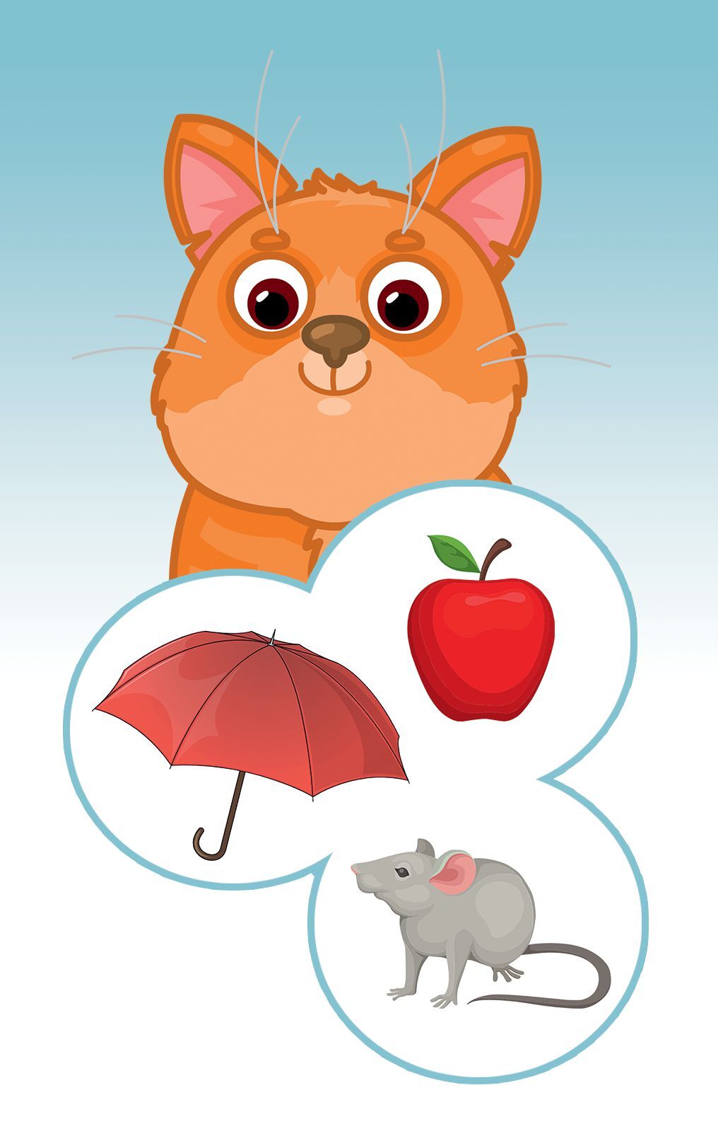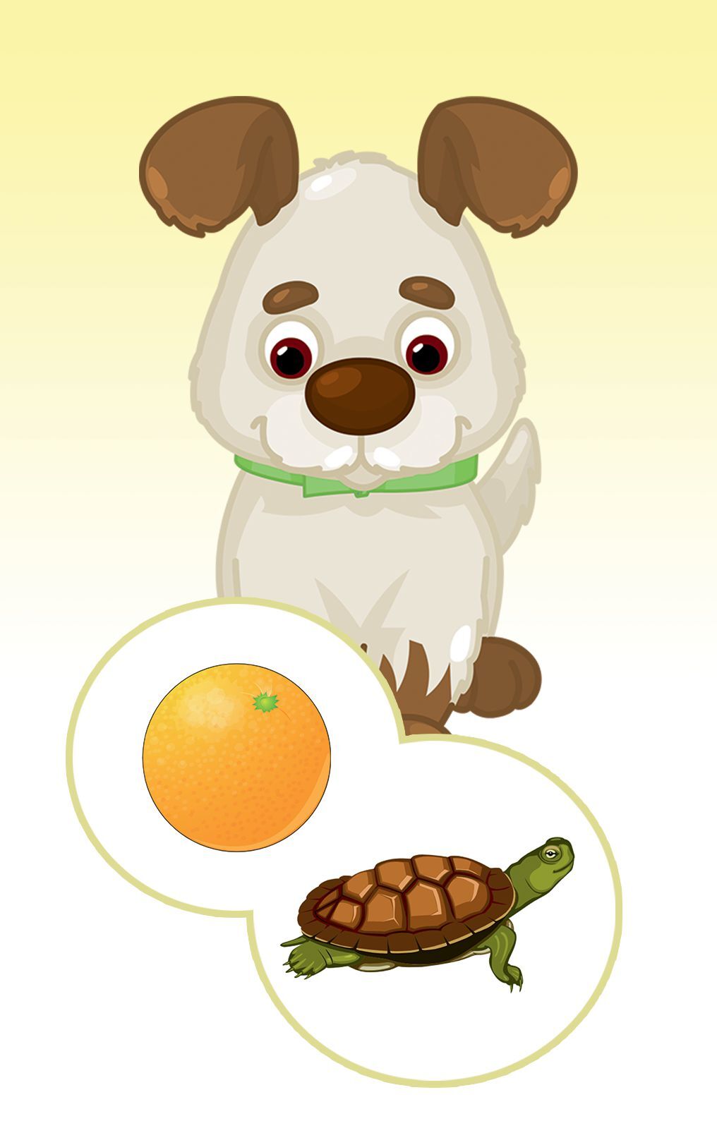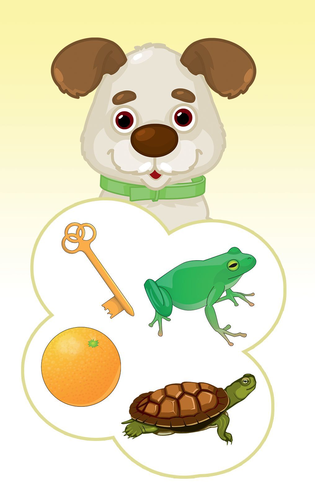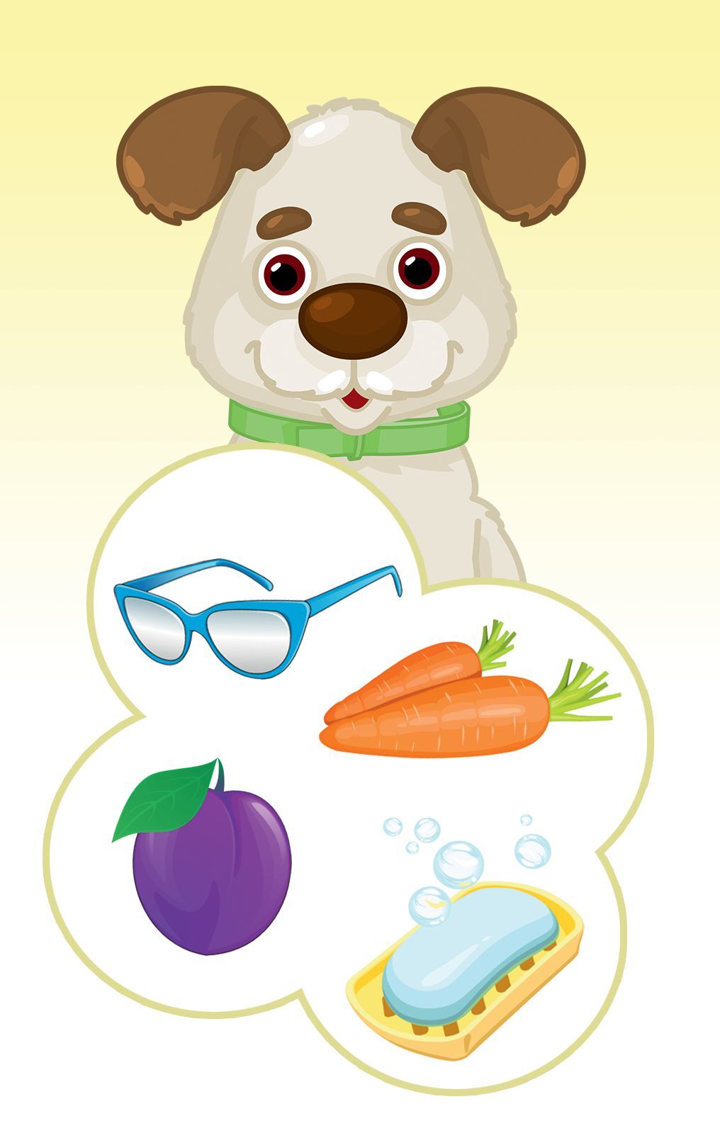 Герои игры — щенок, котенок и зайчонок. Они предлагают ребенку запомнить предметы на одной стороне карточки. Затем перевернуть ее и сказать, что пропало.