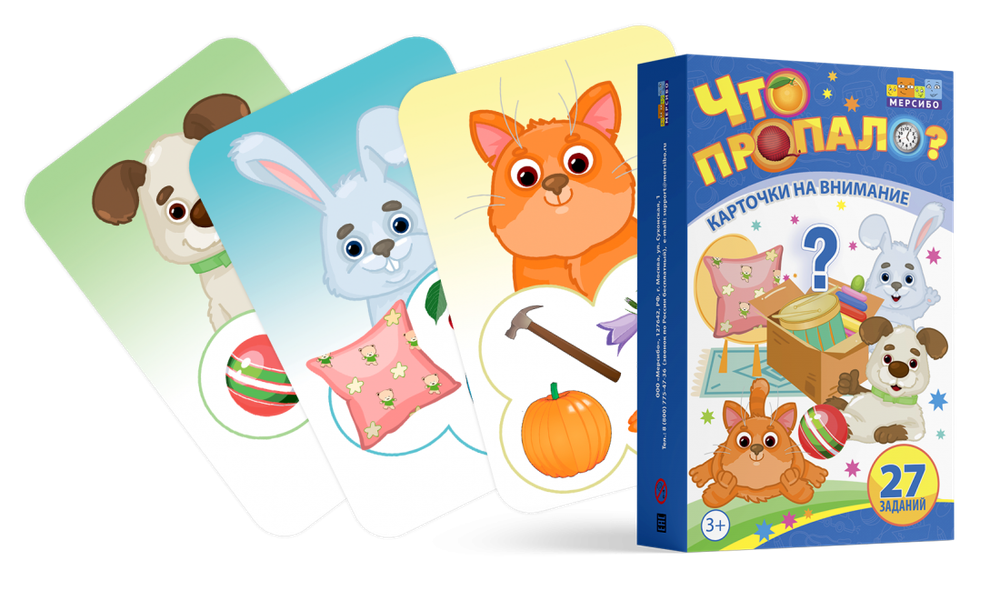 «Что пропало?» — комплект карточек для развития зрительной памяти и внимания у детей от трех лет. Дети развивают мышление и память, совершенствуют словарный запас и расширяют кругозор в игровой форме