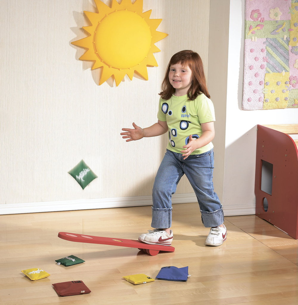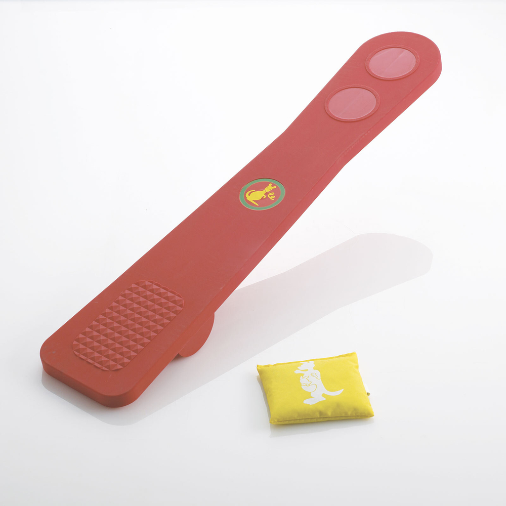 Поместите мешочек на один конец катапульты и топните ногой на другом конце. Мешочек взлетит в воздух для того, чтобы тут же быть пойманым детскими ручками.
