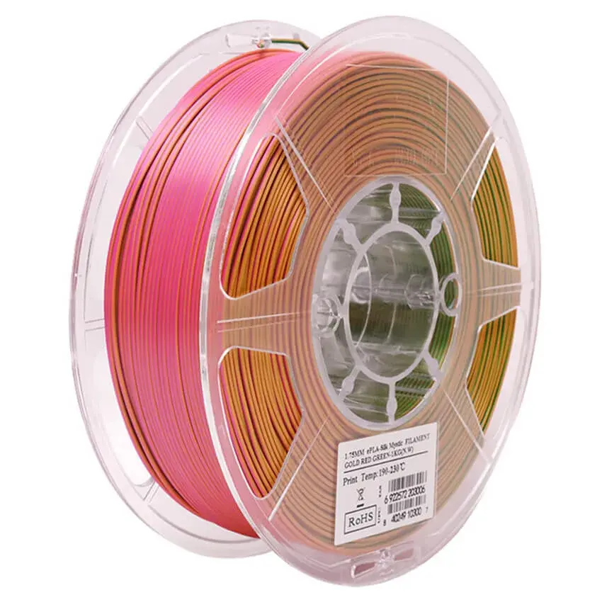 Многоцветный филамент ePLA-Silk Mystic создает удивительное ощущение динамики благодаря трехцветному чередующемуся градиенту. Поверхность ePLA-Silk Mystic с текстурой шелкового блеска гладкая и не создает наслоений. Изделия получаются гладкими и ровными, а также легко отделяются от платформы. Модели, изготовленные из ePLA-Silk Mystic, загадочно играют цветом под разными углами обзора.