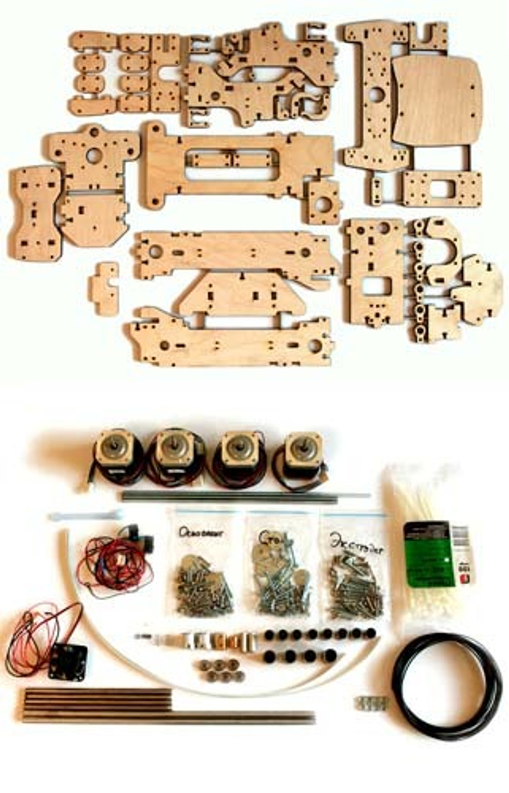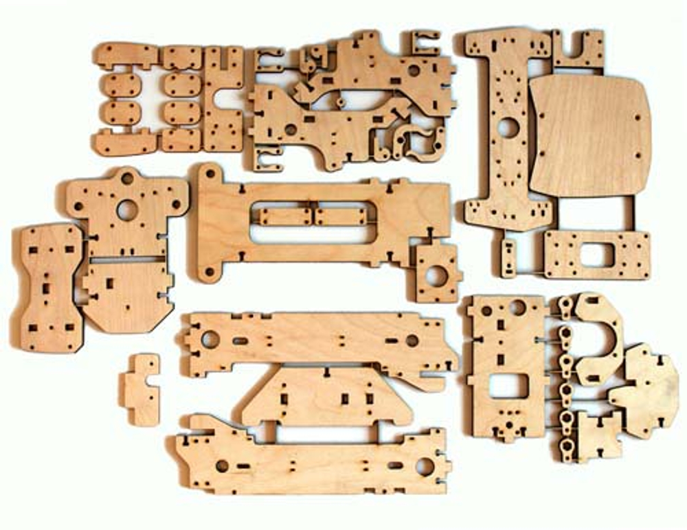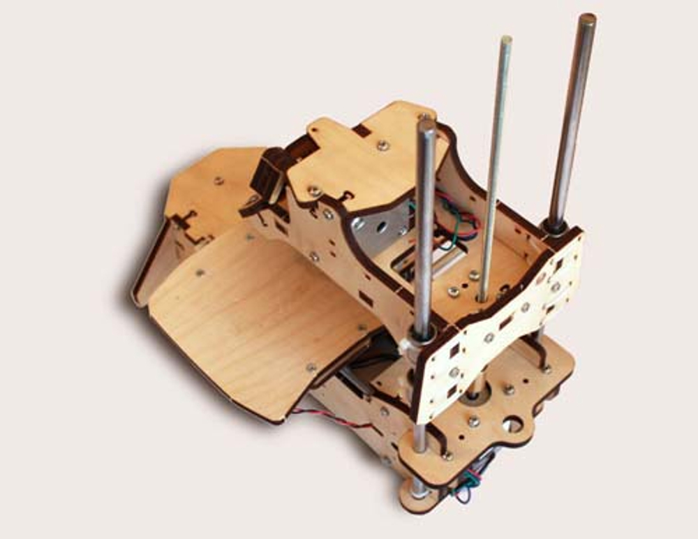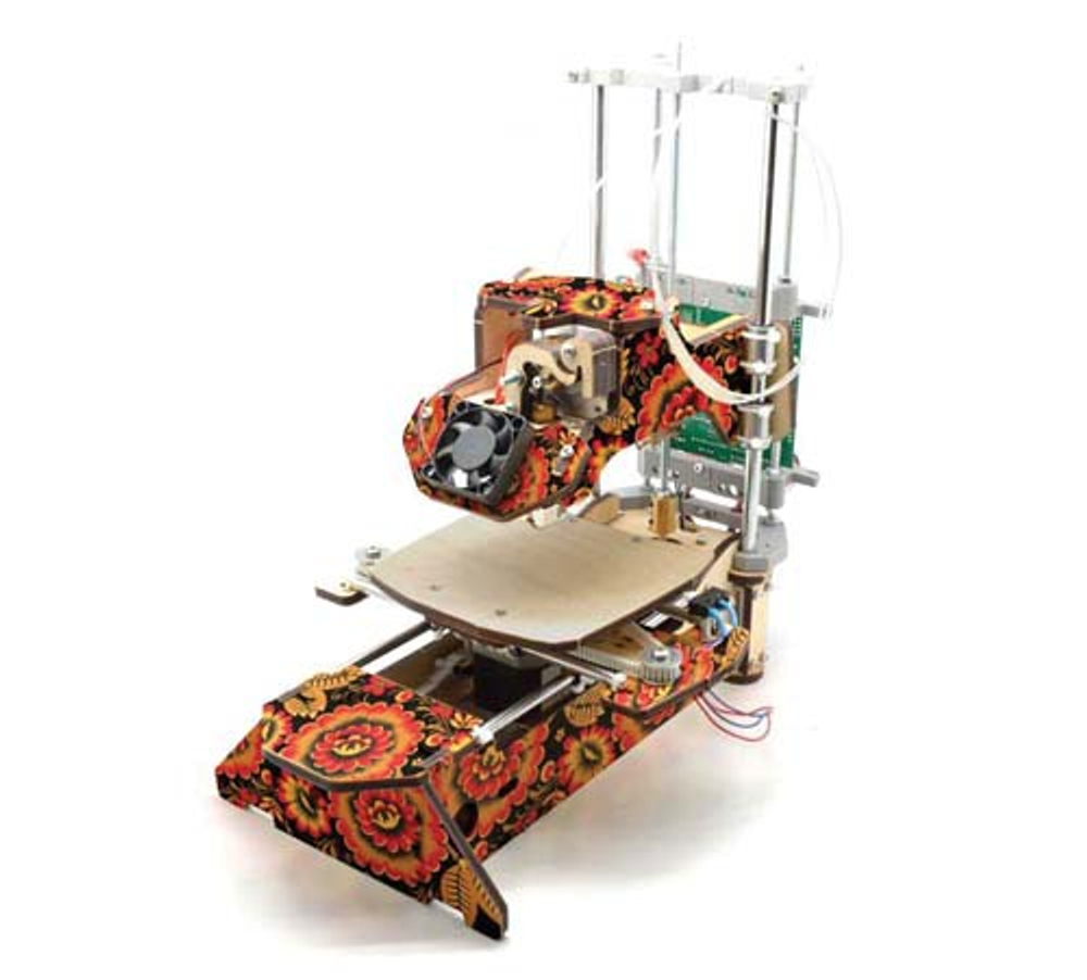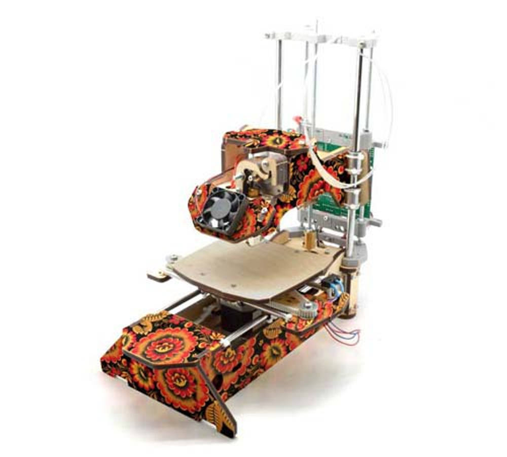 Каркас принтера изготовлен из шлифованной фанеры толщиной 6 мм, перемещение экструдера осуществляется только по вертикали, а вдоль осей X и Y модель перемещается за счет движения рабочего стола. Жесткая конструкция позволяет печтать на высоких скоростях – до 150 мм/с, габариты рабочего поля принтера – 100×100×100 мм.
