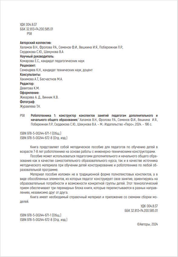 Книга написана коллективом авторов, в который вошли инженеры, педагоги, методисты, руководители, работающие в организациях начального школьного и дополнительного образования и имеющие большой опыт работы по преподаванию робототехники.