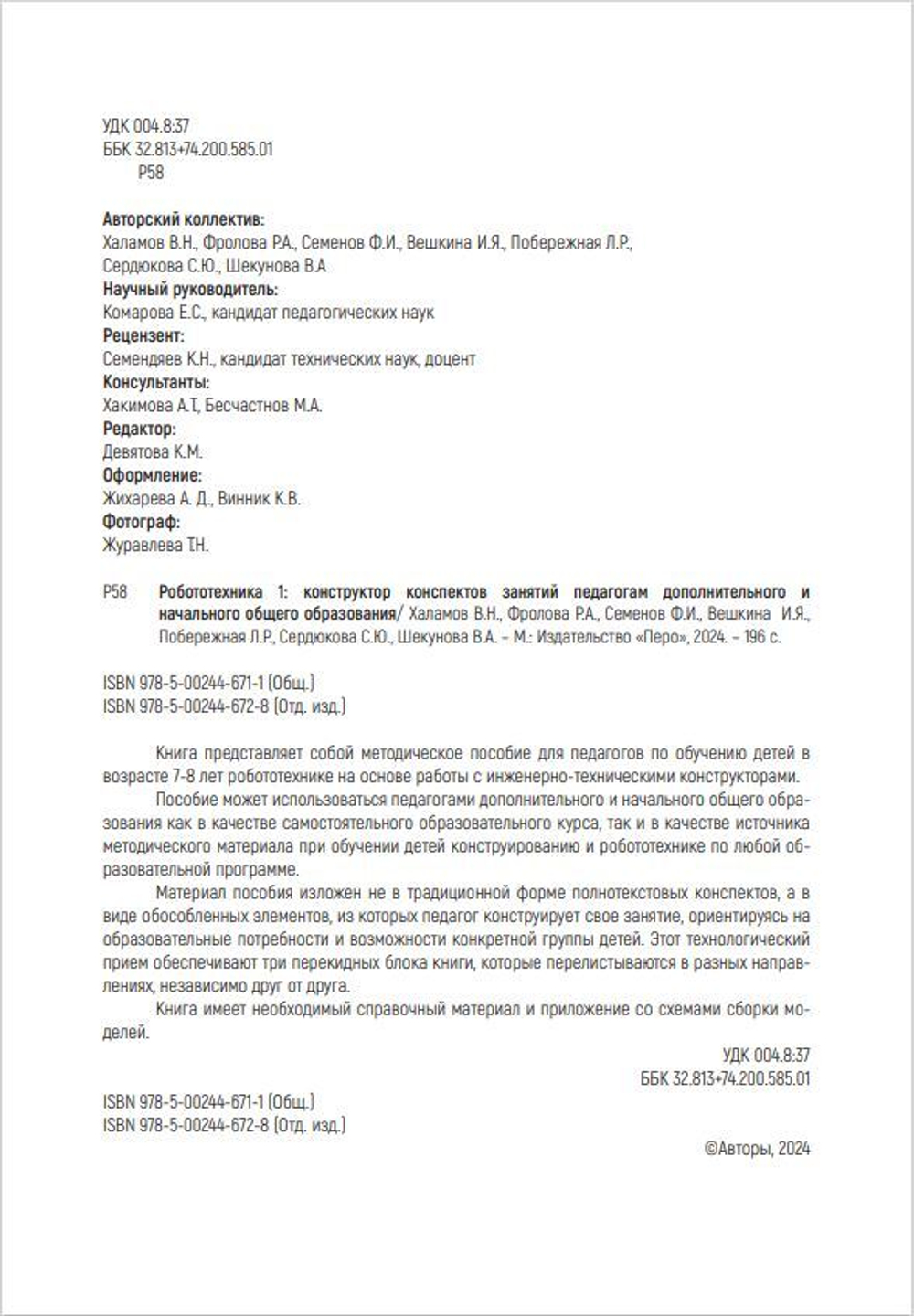 Новое методическое пособие "Робототехника 1. Конструктор конспектов занятий педагогам дополнительного и начального общего образования" ориентировано на обучение детей 7-8 лет (1-го года обучения) основам робототехники. Эта книга – первая часть (стартовый уровень) образовательной программы для младших школьников по робототехнике и конструированию на основе работы с инженерно-техническими конструкторами.