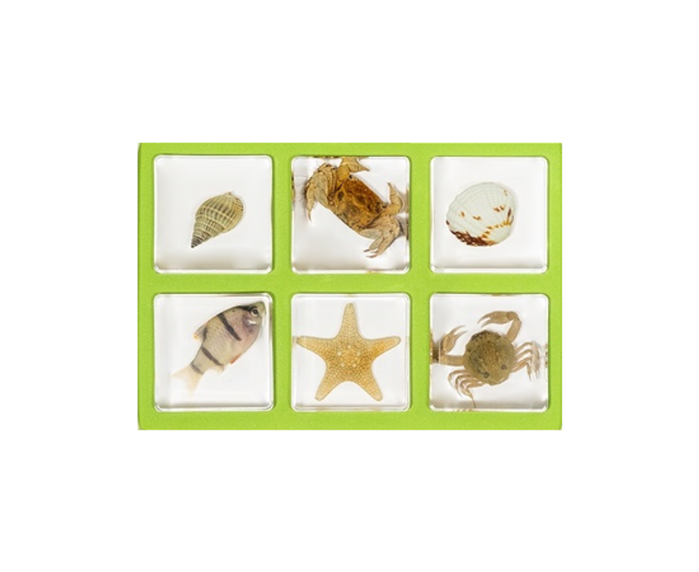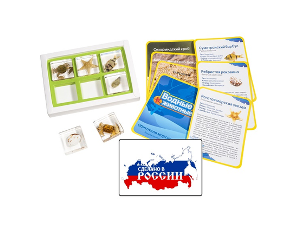 В комплект входят 6 карточек с информацией о представителях водных животных: морская звезда, краб, рыба, раковина брюхоногого моллюска, раковина двустворчатого моллюска. Это позволяет вам изучить различные аспекты жизни морских обитателей и провести их классификацию.