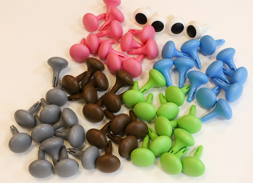 Набор состоит из 128 разноцветных колышек в 6 цветах (розовый, зеленый, голубой, белый с чёрной точкой по центру, коричневый, серый).