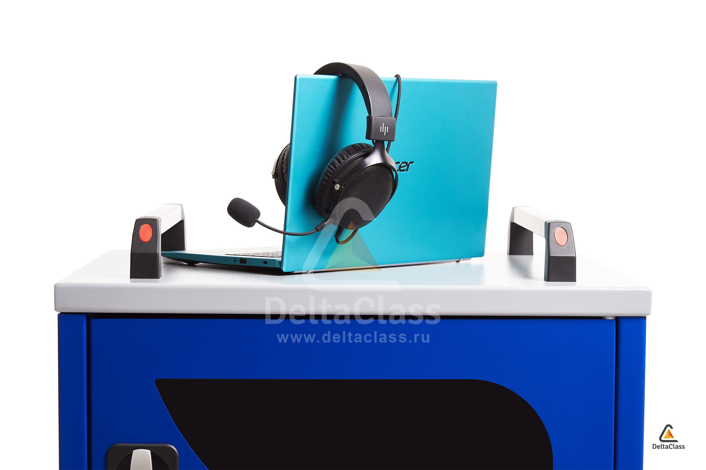 Для размещения лингафонных гарнитур в комбинированной мобильной станции DELTACLASS MODULE применяется многофункциональный лоток с перфорированными ячейками. Многофункциональный лоток изготовлен из непрозрачного пластика, устойчивого к бактерицидному электромагнитному излучению ультрафиолетового диапазона. Отсек для лингафонных гарнитур оснащен бактерицидным ультрафиолетовым излучателем для обеззараживания поверхностей амбушюр и микрофонов.