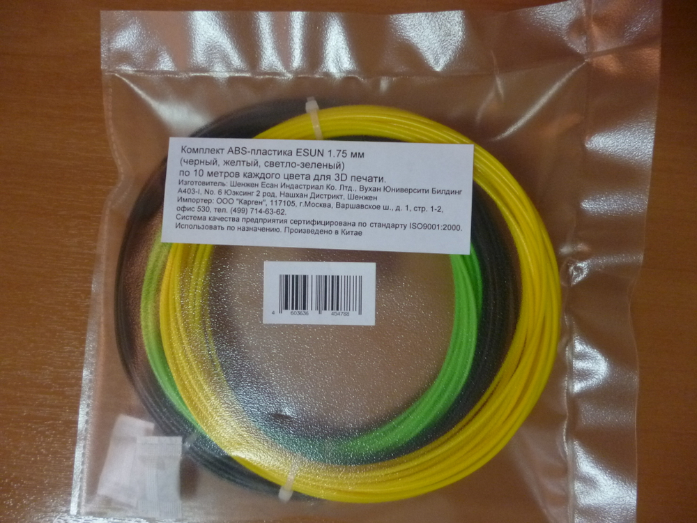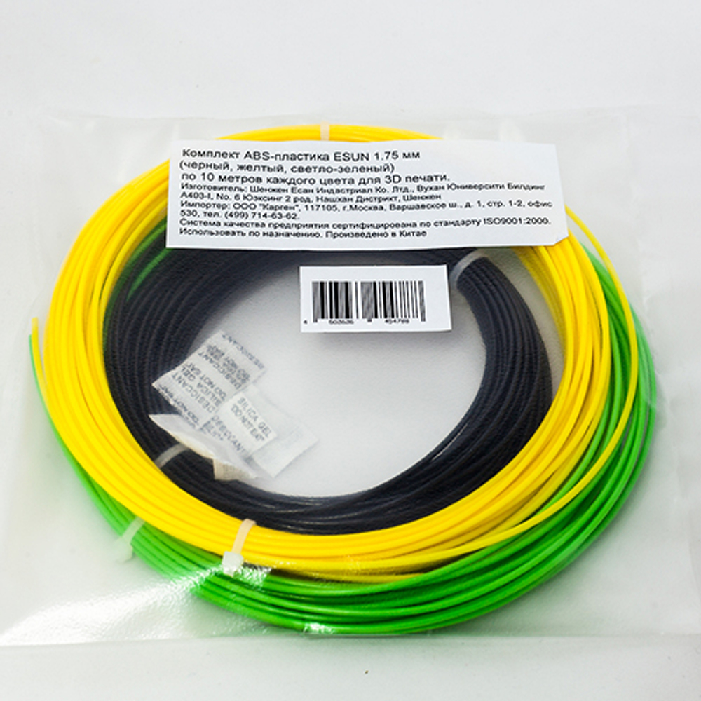 Комплект ABS-пластика ESUN 1.75 мм. для 3D ручек (черный, желтый, светло-зеленый), 10 метров каждого цвета.