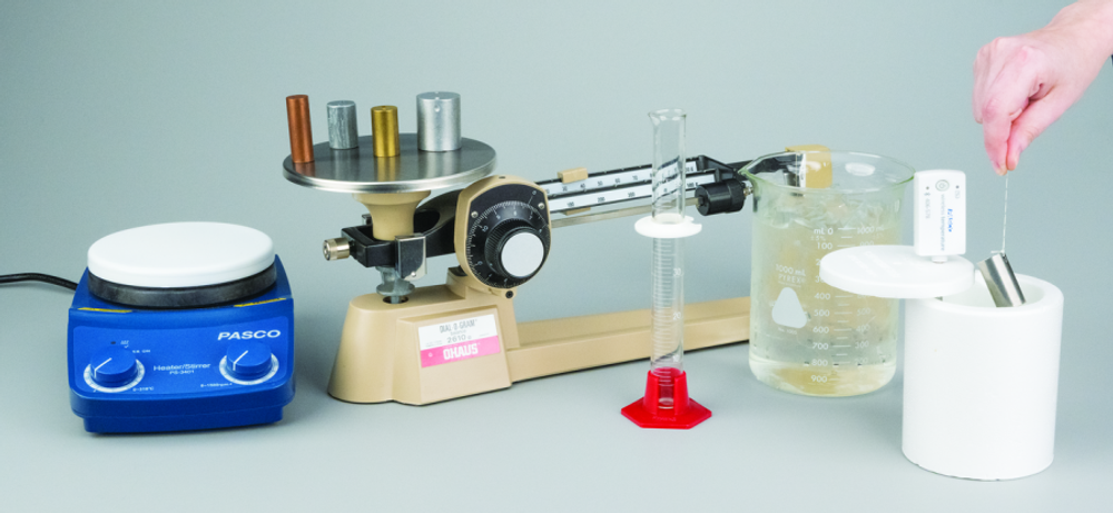 Беспроводной комплект «Удельная теплоёмкость» PASCO используется для проведения эксперимента по определению материалов с использованием удельной теплоёмкости в качестве измеряемой характеристики.