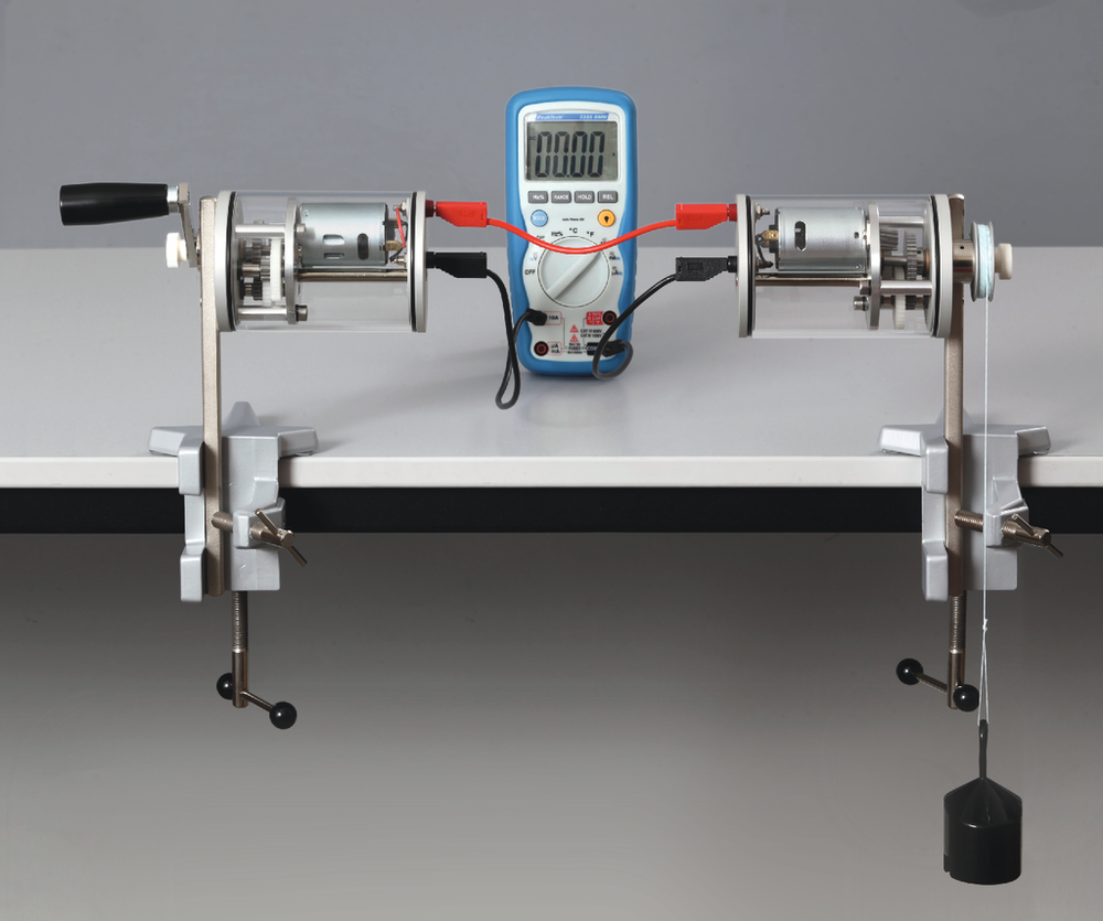 В наборе : мотор-генератор DynaMot, зажим к столу, муфта, вращающийся блок, механическая передача, опорный стержень, грузы с крюком, провода, защитные коврики.