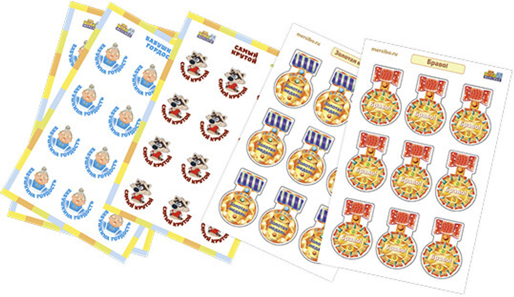 Для поощрения детей в комплекте предусмотрены 2 набора тематических наклеек с мотивирующими фразами и изображениями.