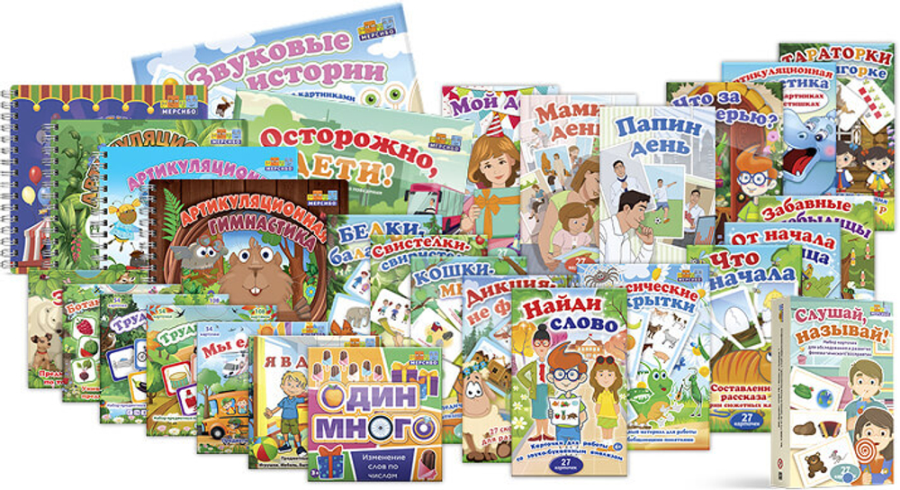 Артикуляционная гимнастика в картинках и стишках, Бежит-лежит, Белки-балаболки, Ботанический сад, Детское кафе, Дикция — не фикция, Зоосад, Забавные небылицы, Звукоподражалки, Королевская башня, Кочка за кочкой 1, Кочка за кочкой 2, Кошки-мышки, Ладушки-оладушки, Летает — не летает, Найди слово, Один-много, От начала до конца, Мамин день, Мой день, Мы едем, едем, Папин день, Пень за пнем, Свистелки-свиристелки, Слушай-называй!, Стишата-малышата, Тараторки на пригорке, Трудные звуки 1, Трудные звуки 2, Учусь говорить, Что за дверью?, Что пропало?, Что сначала, Я в домике