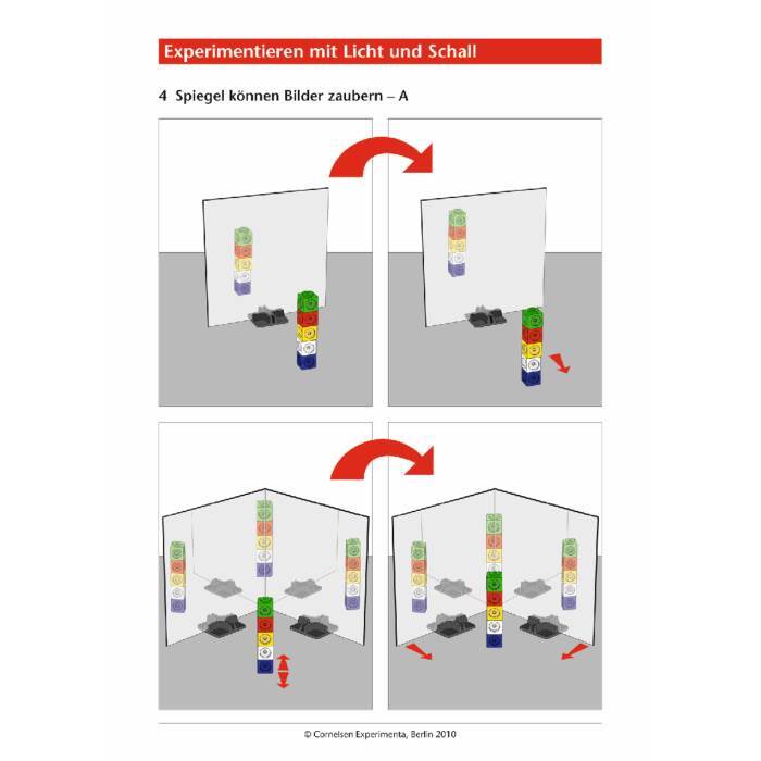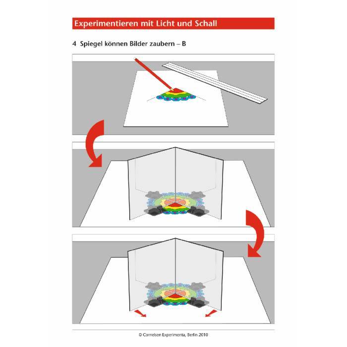 Позволяет провести 33 опыта по 15 темам. Дети экспериментируют с источниками света и звука, знакомятся с тем, как распространяется свет и преломляется, как он отражается в зеркале и стекле, что такое цвет света, и узнают, как можно увидеть малое большим. Эксперименты со звуком позволяют детям ответить на вопрос, откуда возникает звук, как можно увидеть и почувствовать его, и даже сконструировать забавный телефон.