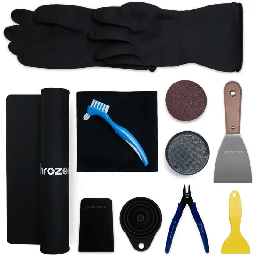Перчатки, силиконовые накладки и чистящие салфетки входят в комплект Phrozen, что позволяет поддерживать порядок на рабочем месте и защищать руки от смолы и химикатов.