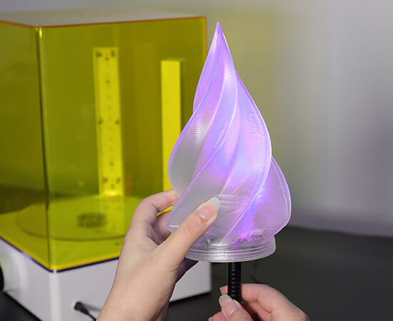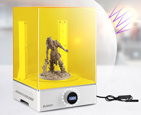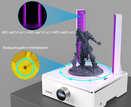 Устройство для отверждения оснащено двумя регулируемыми L-образными световыми панелями и четырьмя дополнительными светодиодами, расположенными под вращающимся на 360° поворотным столом. В сочетании с линзой Френеля происходит равномерное УФ-излучение с длиной волны 405 нм. Это обеспечивает равномерное отверждение моделей со всех сторон.