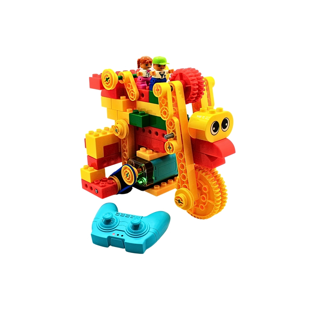 Этот набор представлен как дополнение к стандартному набору «Первые механизмы». С ним вы сможете управлять своими механизмами дистанционно. В конструкторе присутствует джойстик, двигатель, адаптеры направления, которые будут регулировать движение набора в определенном направлении и оси вращения, которые скрепляют всю эту систему.
