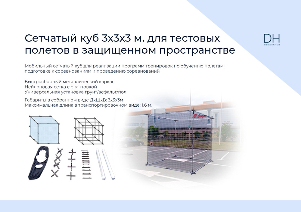 – 1x Сетчатый куб 3х3х3 м. для тестовых полетов в защищенном пространстве