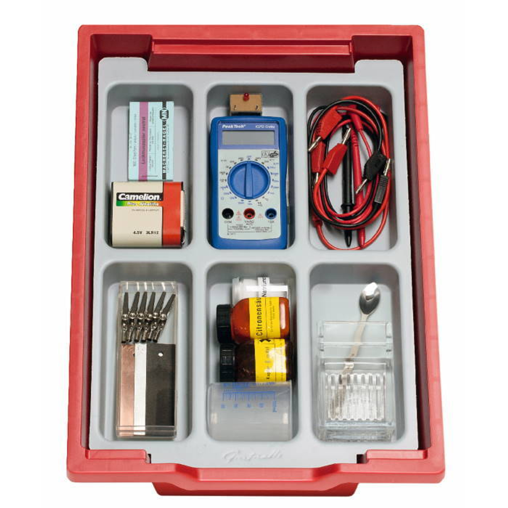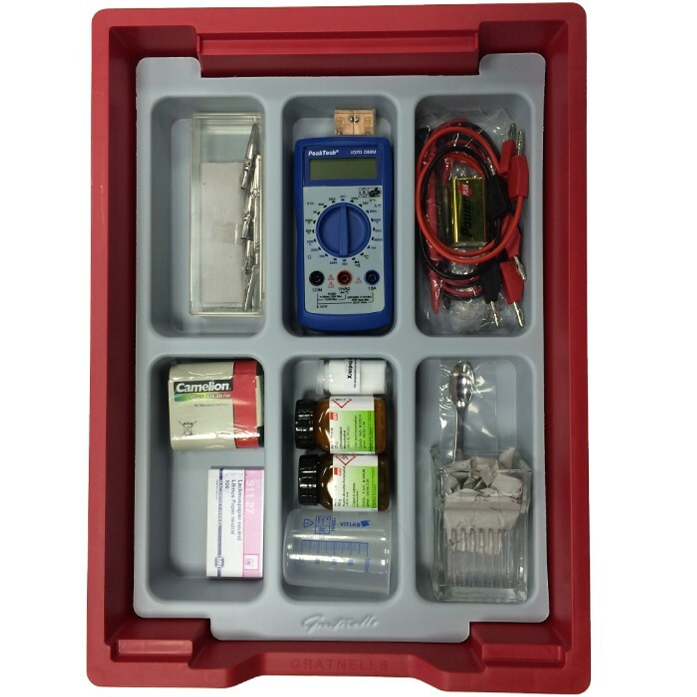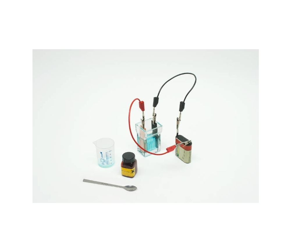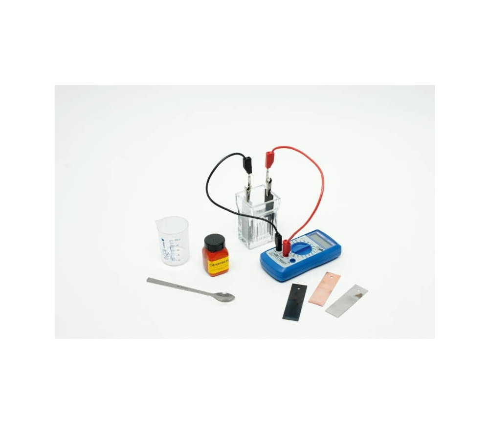 Комплект содержит все детали и химикаты, необходимые для проведения базовых экспериментов по электрохимии. Индикатором возникающих напряжений служит цифровой мультиметр. Инструкция по тестированию прилагается к комплекту оборудования.