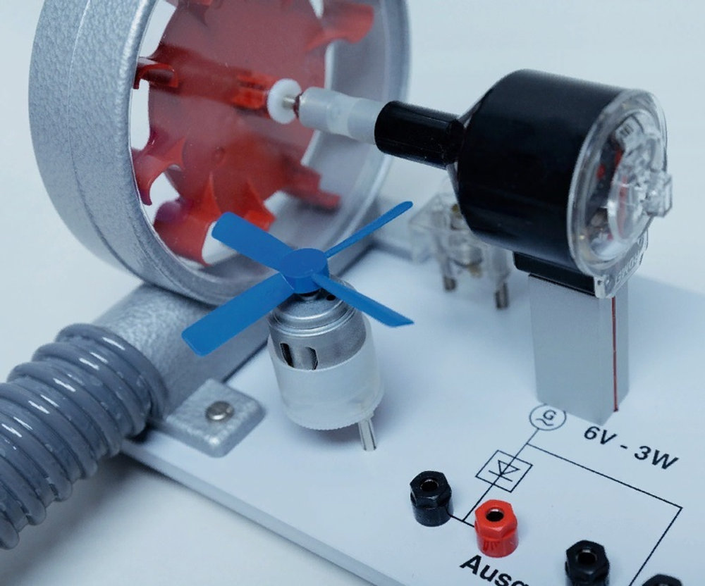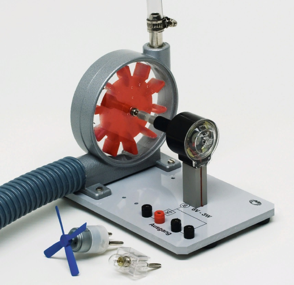 Модель гидроэлектростанции состоит из свободной реактивной турбины и генератора, с прозрачной торцевой заслонкой, установленной на общем валу, на базовой доске с электрической схемой и двумя выходными разъемам для постоянного и переменного напряжения для подключения потребителей. Лампа накаливания и электродвигатель с пропеллером, каждый на штекерном элементе, могут быть подключены к выходным разъемам в качестве потребителя.