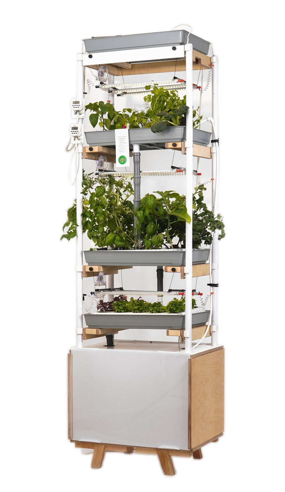 4 этажа с поддонами 440*570*60 мм (0.25 м² посевной площади) с ребристым дном, универсальной системой контроля уровня подтопления и слива