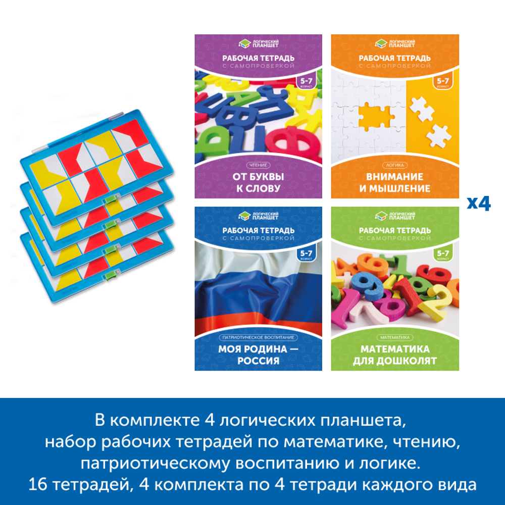 • 16 рабочих тетрадей по предметных областям: математика, чтение, патриотическое воспитание и логика (по 6 каждого вида)