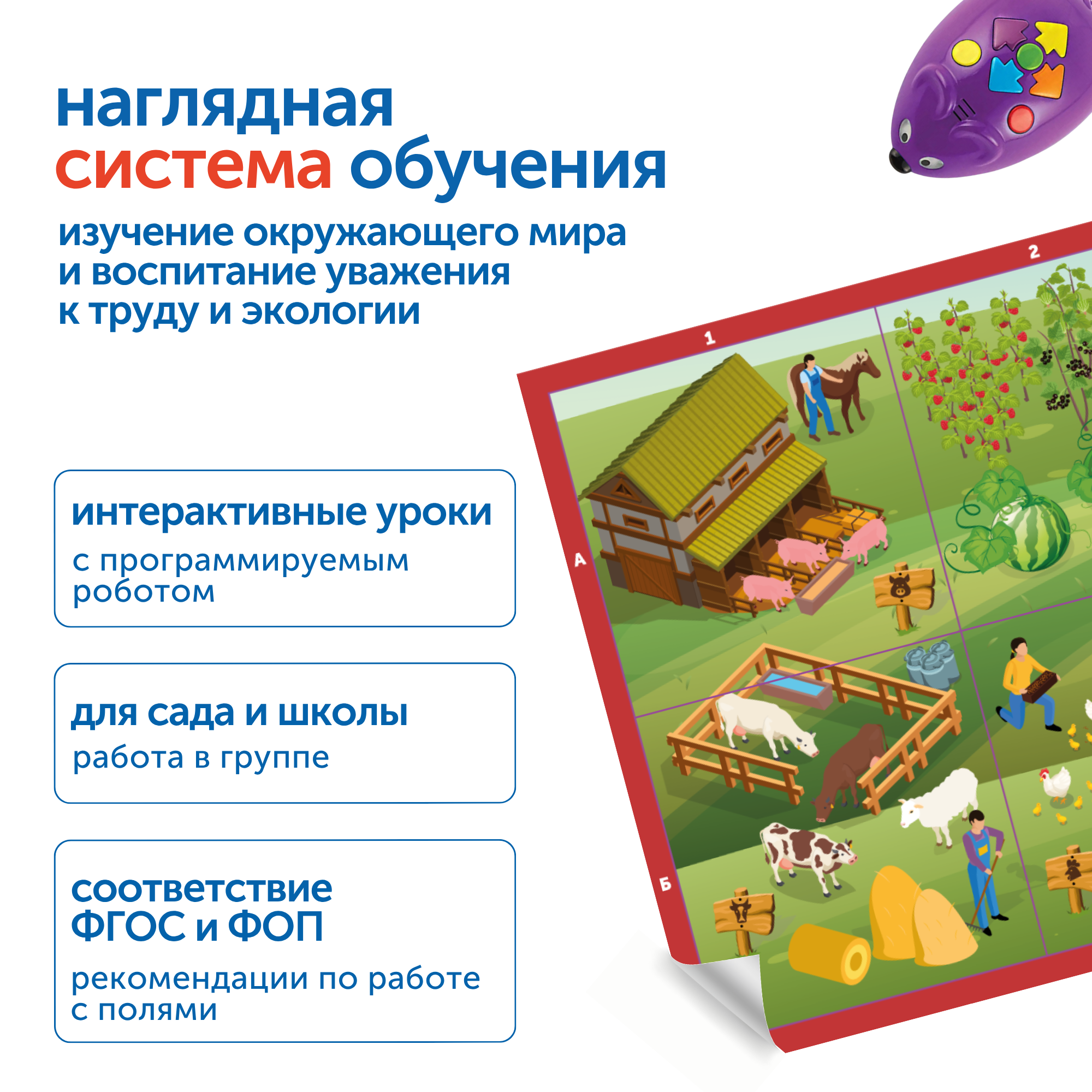 Программирование и трудовое воспитание — два приоритетных направления дошкольного образования, реализованные в STEM-комплекте «Наше сельское хозяйство с РобоМышью» (купить в Москве и по всей России).