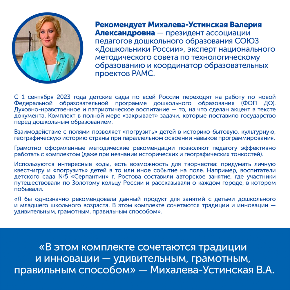 По независимой оценке Михалевой-Устинской Валерии Александровны, президента СОЮЗа «Дошкольники России», данный комплект: