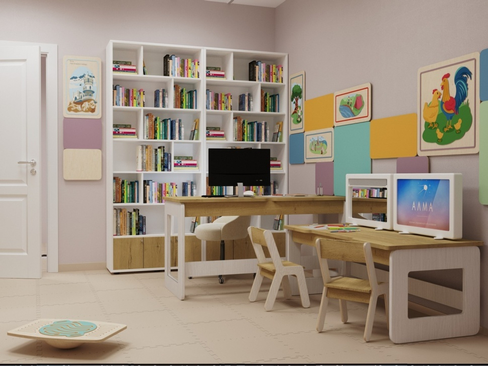 Готовый комплект содержит: стол психолога-дефектолога, рабочий стол для детей, компьютер специалиста с программным обеспечением для психологов «Профиль психолога АЛМА», интерактивную сенсорную панель с набором общеразвивающих программ для дошкольников, дидактическую панель «Гармония», кресла-мешки, набор корпусной мебели, нейротренажеры, методические материалы, обучающие пособия и многое другое.