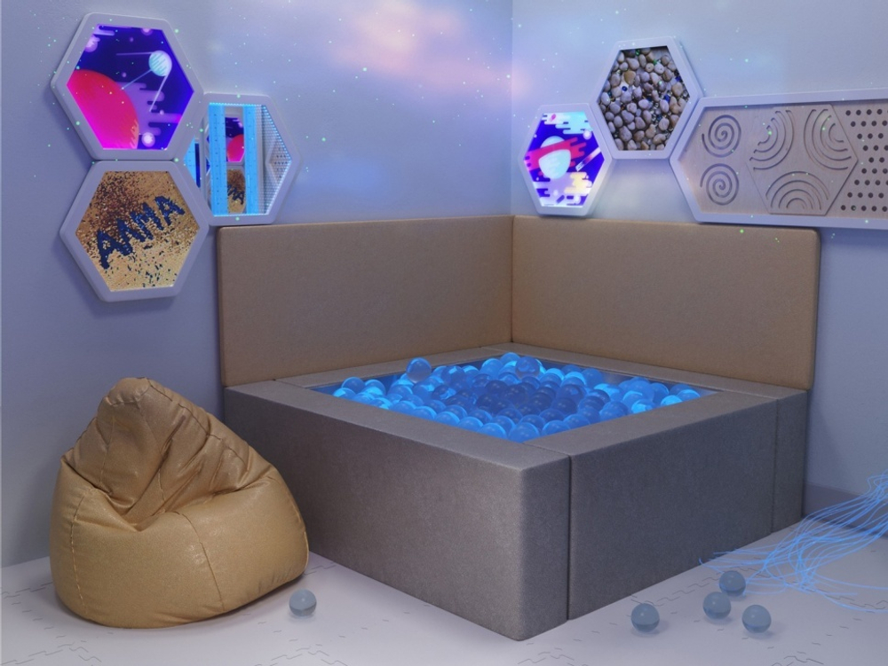 Сухой бассейн с шариками – это универсальное оснащение для сенсорной комнаты, в нём можно как играть и веселиться, так и расслабляться под тихую, спокойную музыку, чувствуя успокаивающее давление шариков на кожу. Подходит для активационной и релаксационной практики.